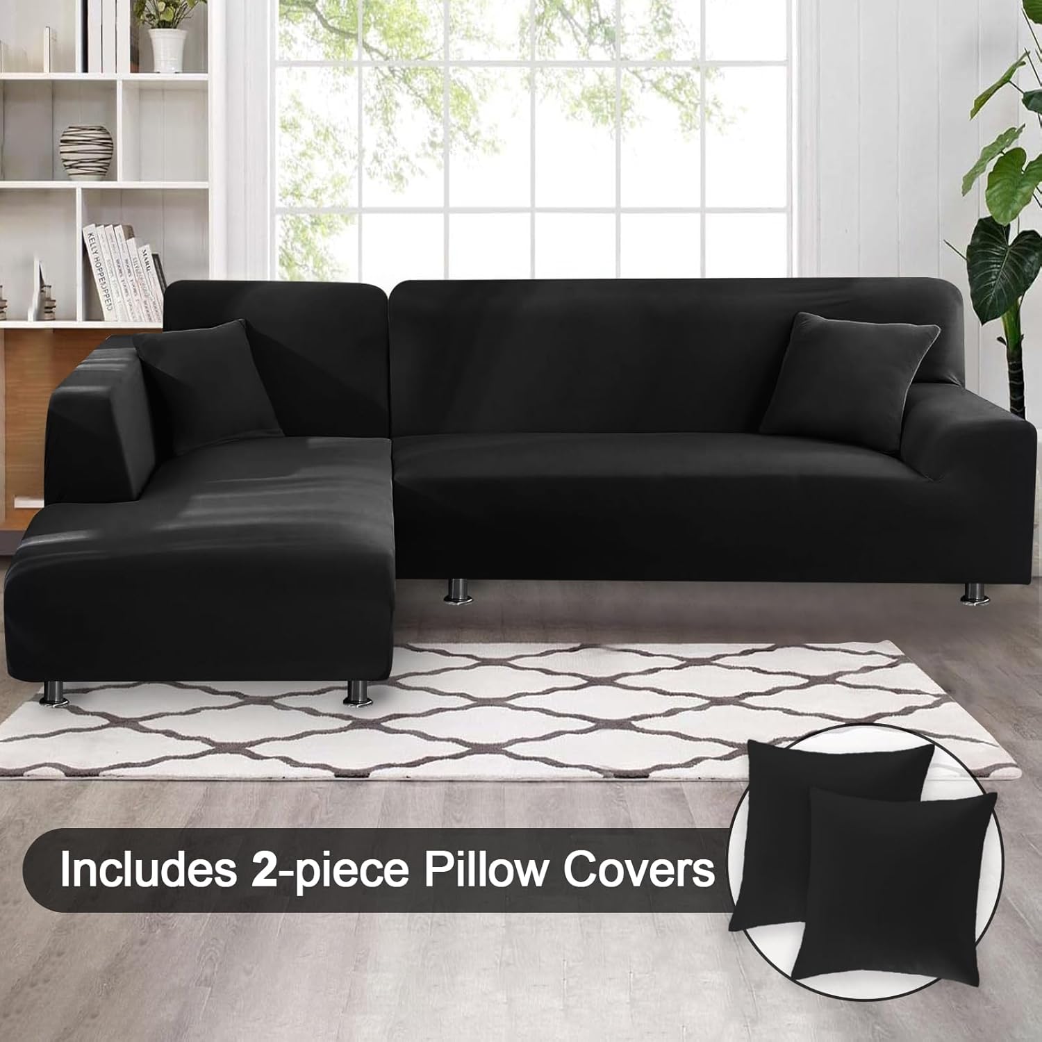 Sectional Couch Covers 2-Piece Softness L Shaped Sofa Cover Super Stretch L-Type Couch Slipcover with 2Pcs Pillowcases Sofa Slipcover 3 Seater + 3 Seater Furniture Protector (Black)