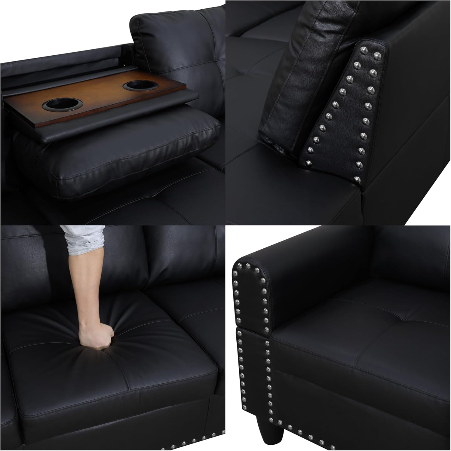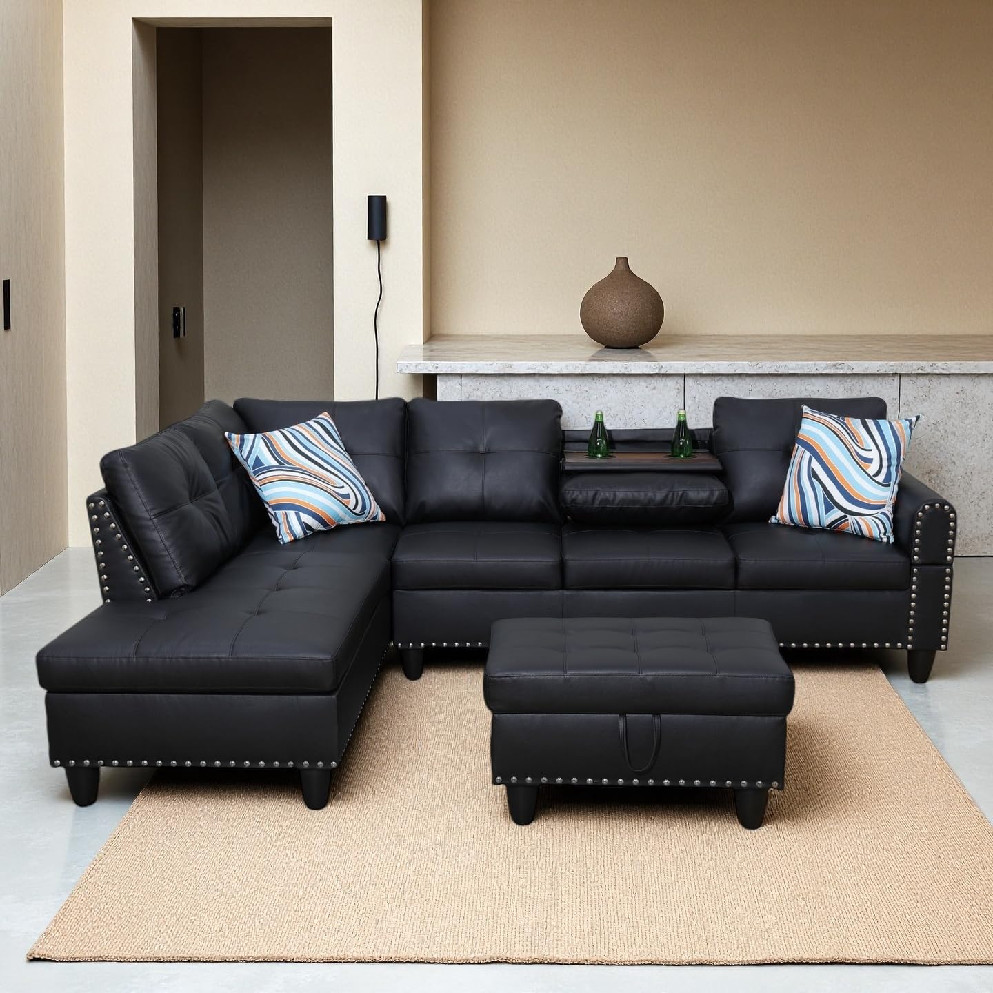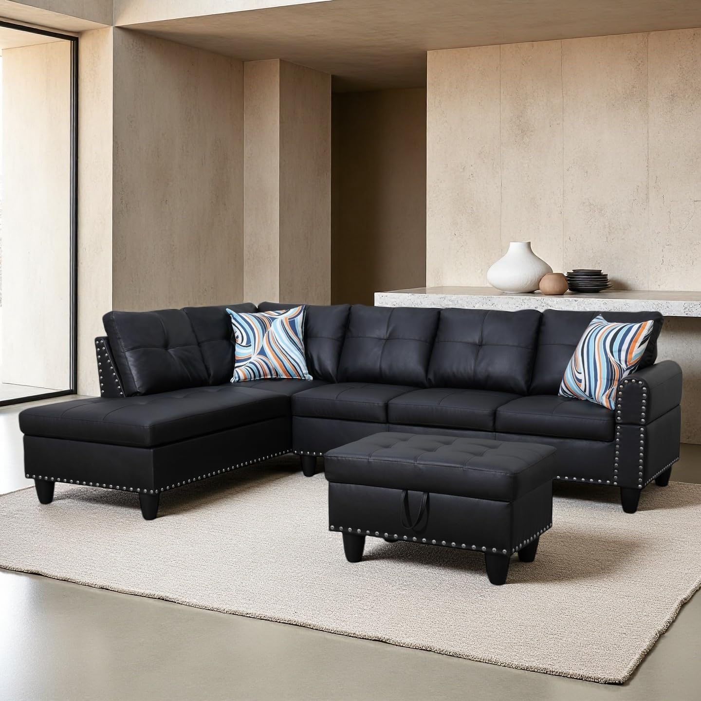 Sectional Couches for Living Room, Convertible 4 Seat Modular Sectional Sofa Set for Living Room, L Shaped Couch or U Shaped Couch with Storage Ottoman for Apartment, Leather Black