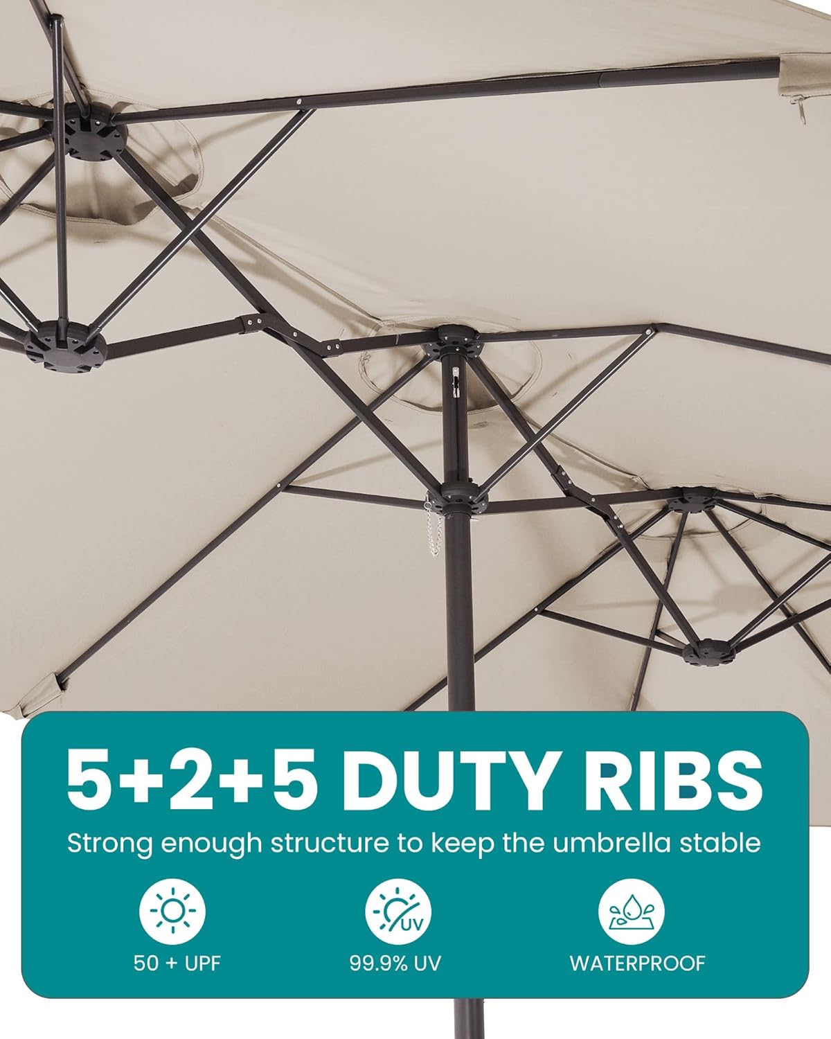 【15FT Double-Sided Patio Umbrella】This extra-large shade blocks sunlight effectively while its 3 top vents improve airflow, reducing heat buildup and enhancing stability in windy conditions.