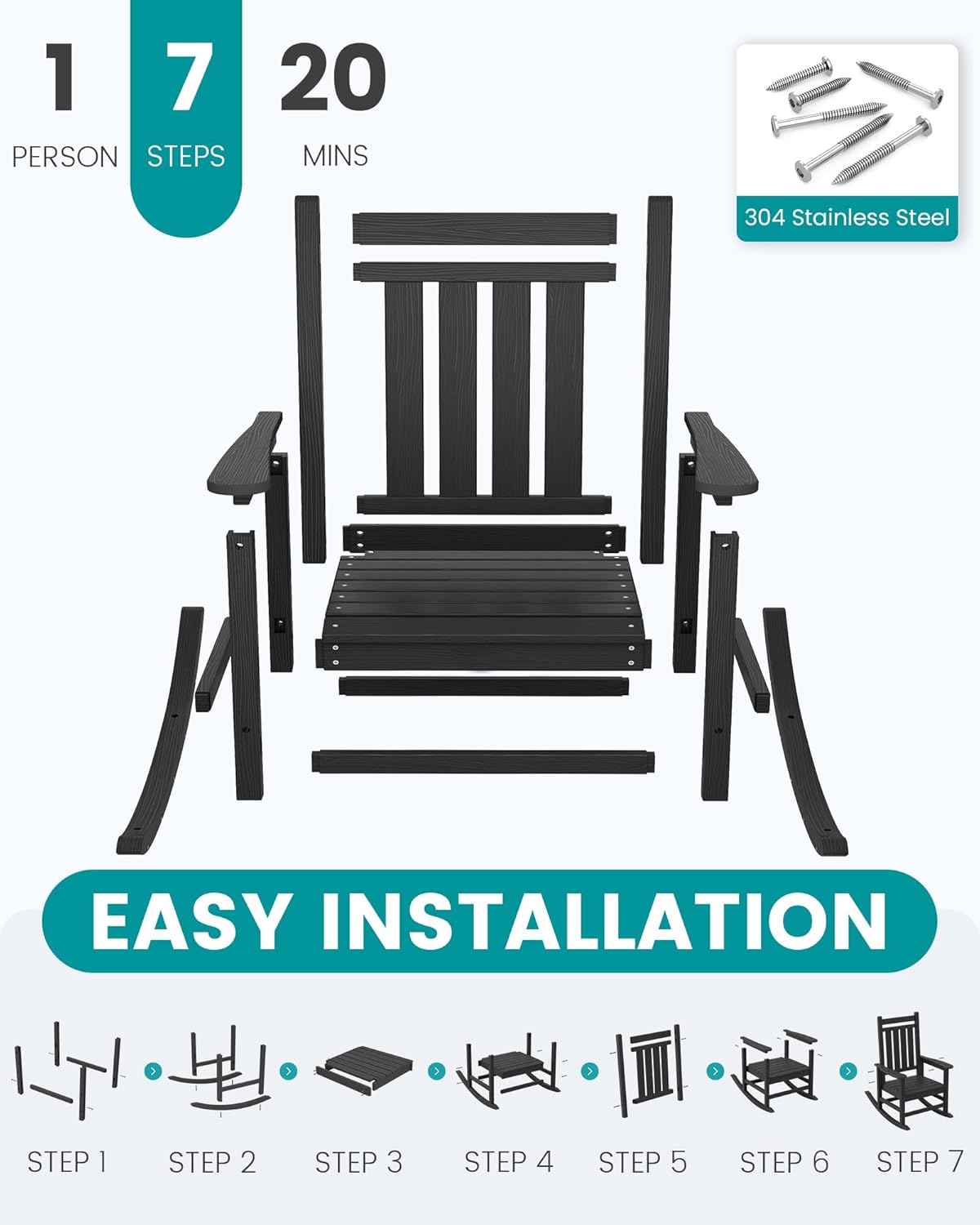 30-Mins Installation: Your SERWALL porch rocking chair requires just 30 minutes to assemble with included hardware and instructions. An online video guide is available for this patio rocking chair.(Note: For best results with your outdoor rocking chair, fully tighten screws only after complete assembly.)