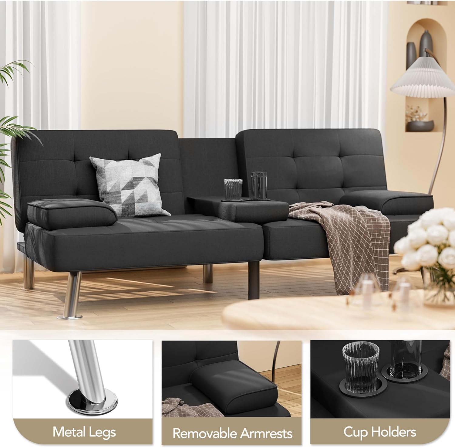 Shahoo Modern Linen Upholstered Convertible Folding Futon Sofa Bed with Removable Armrests, Metal Legs, 2 Cup Holders for Living Room, Black
