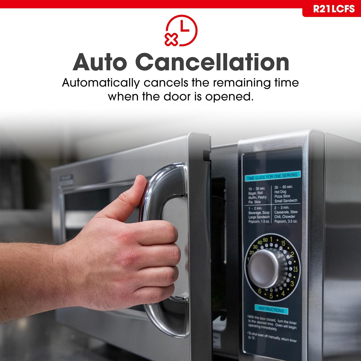 AUTO-CANCEL TIMER: When the door is opened during cooking, the remaining time is cancelled; saving energy and increasing the magnetron’s life.