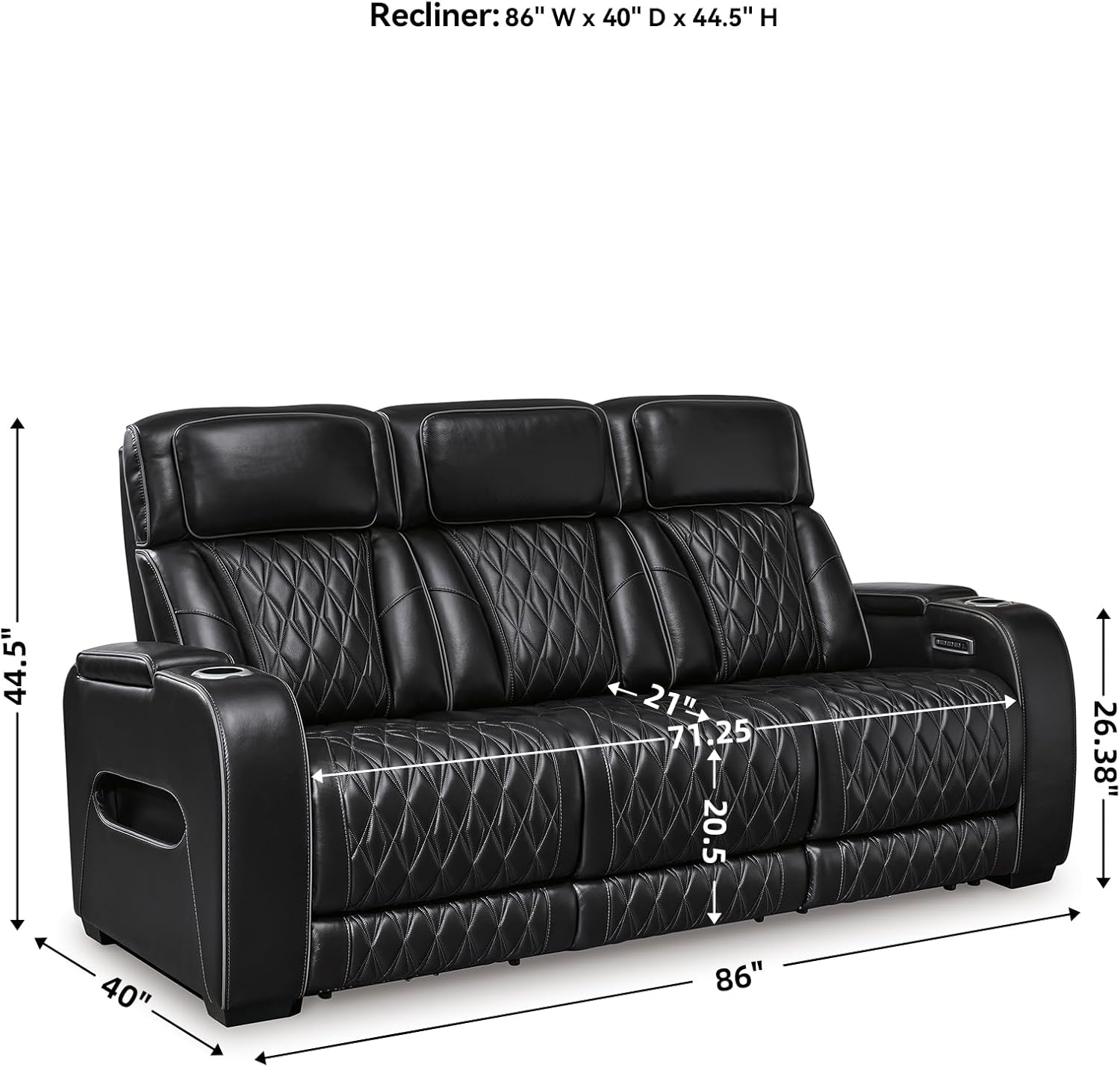 GENEROUS SIZE: Measures 86″ W x 38.5″ D x 44.5″ H. Fully reclined length: 71″. Seat depth: 20.5″. Seat height: 20.25″. Arm height: 26.25″. Distance between recliner and wall should be at least 8.75″