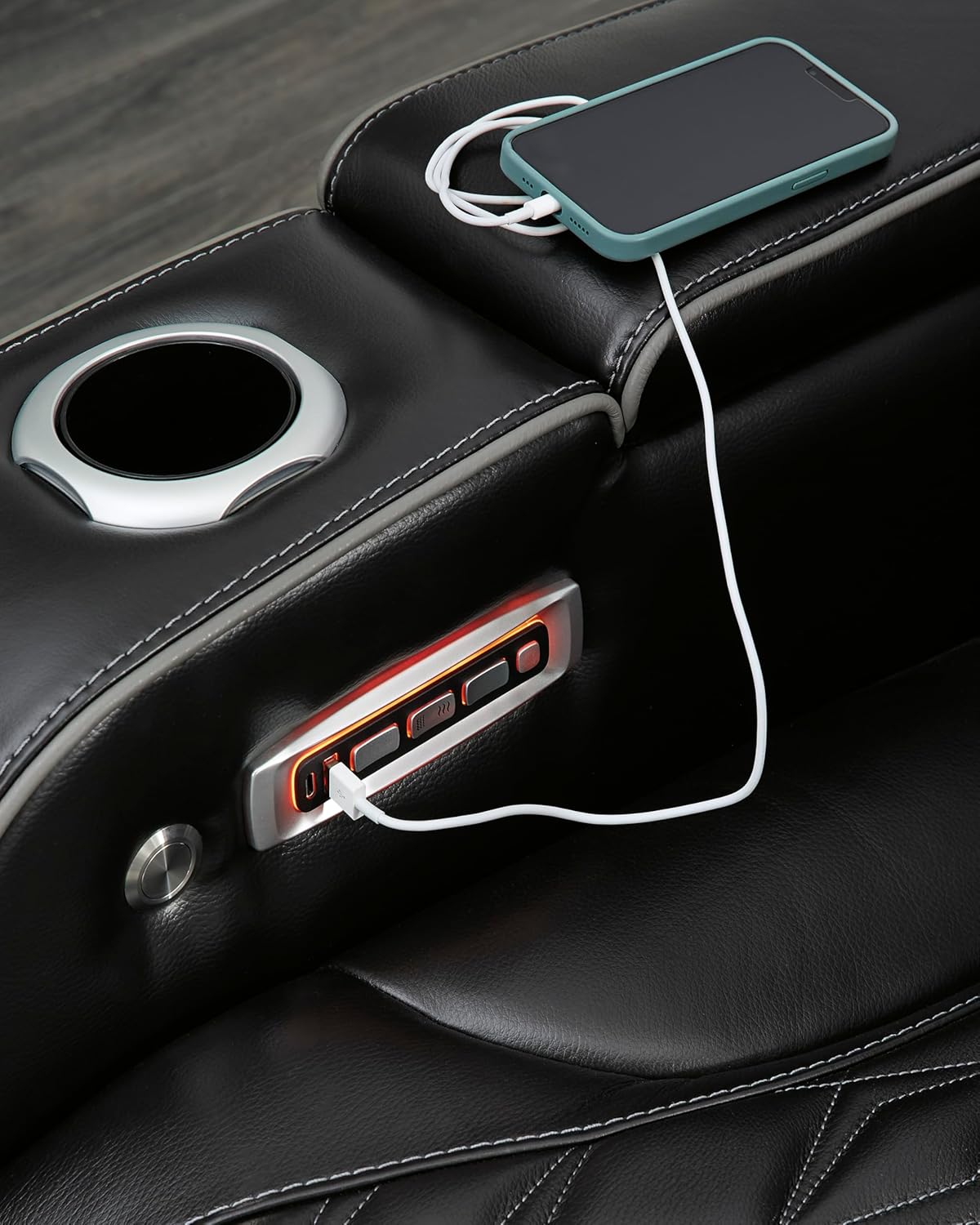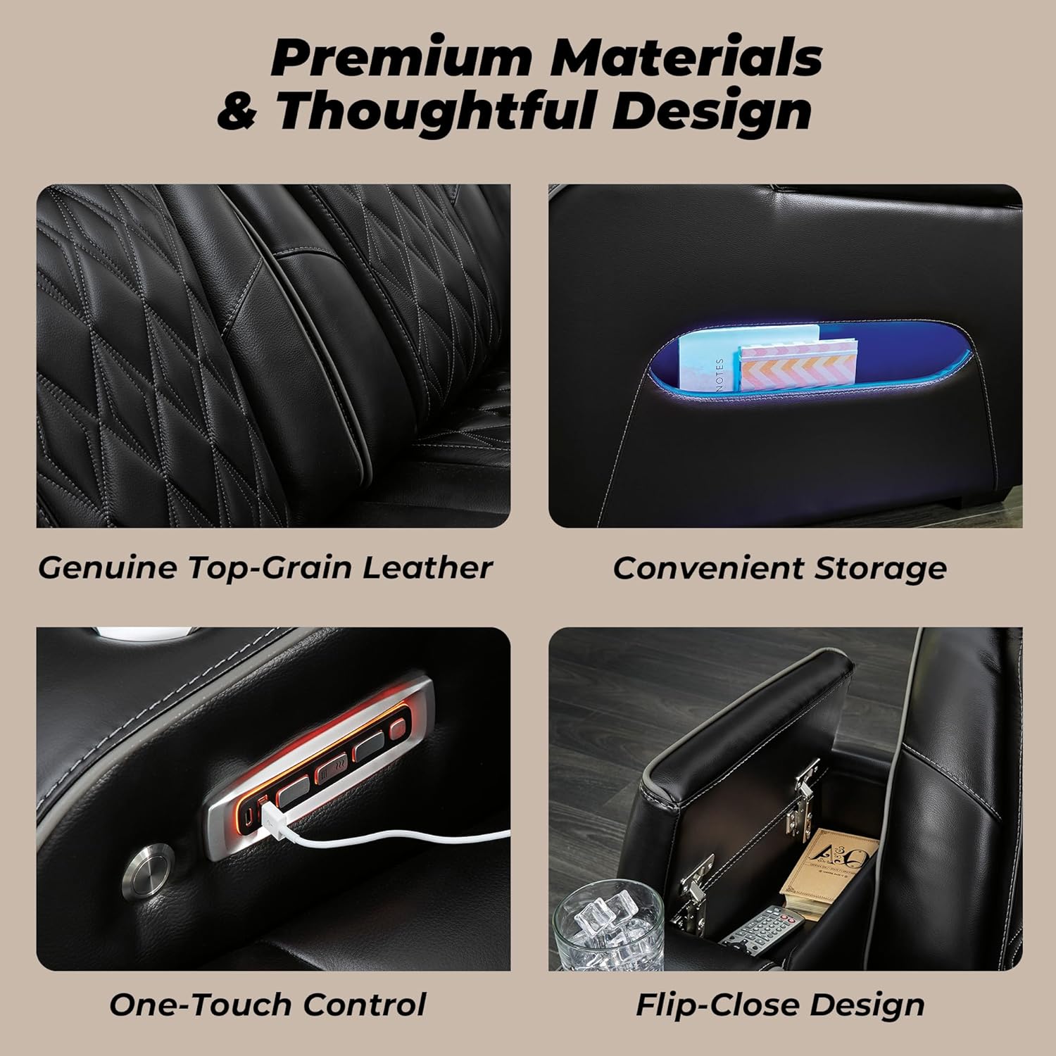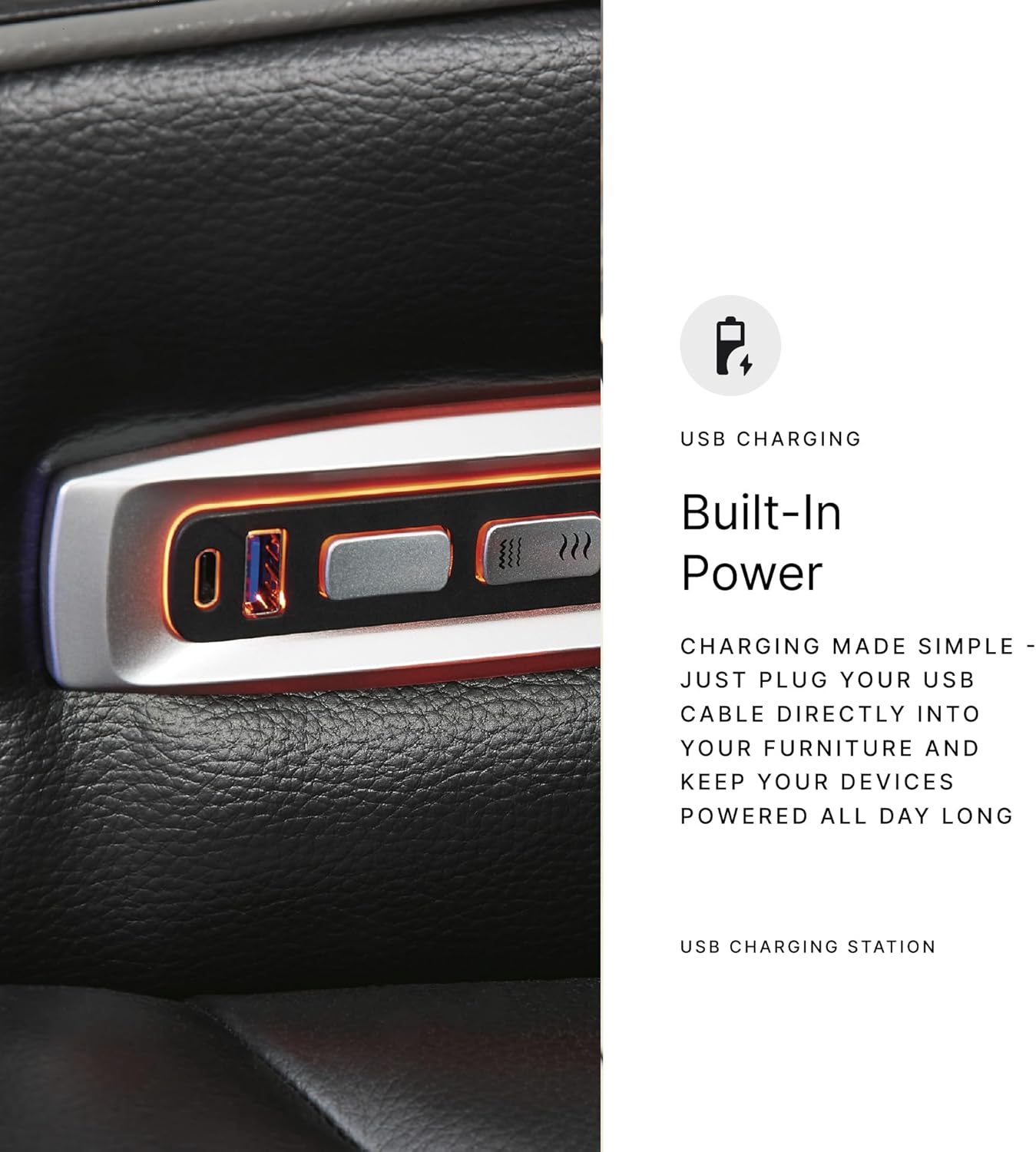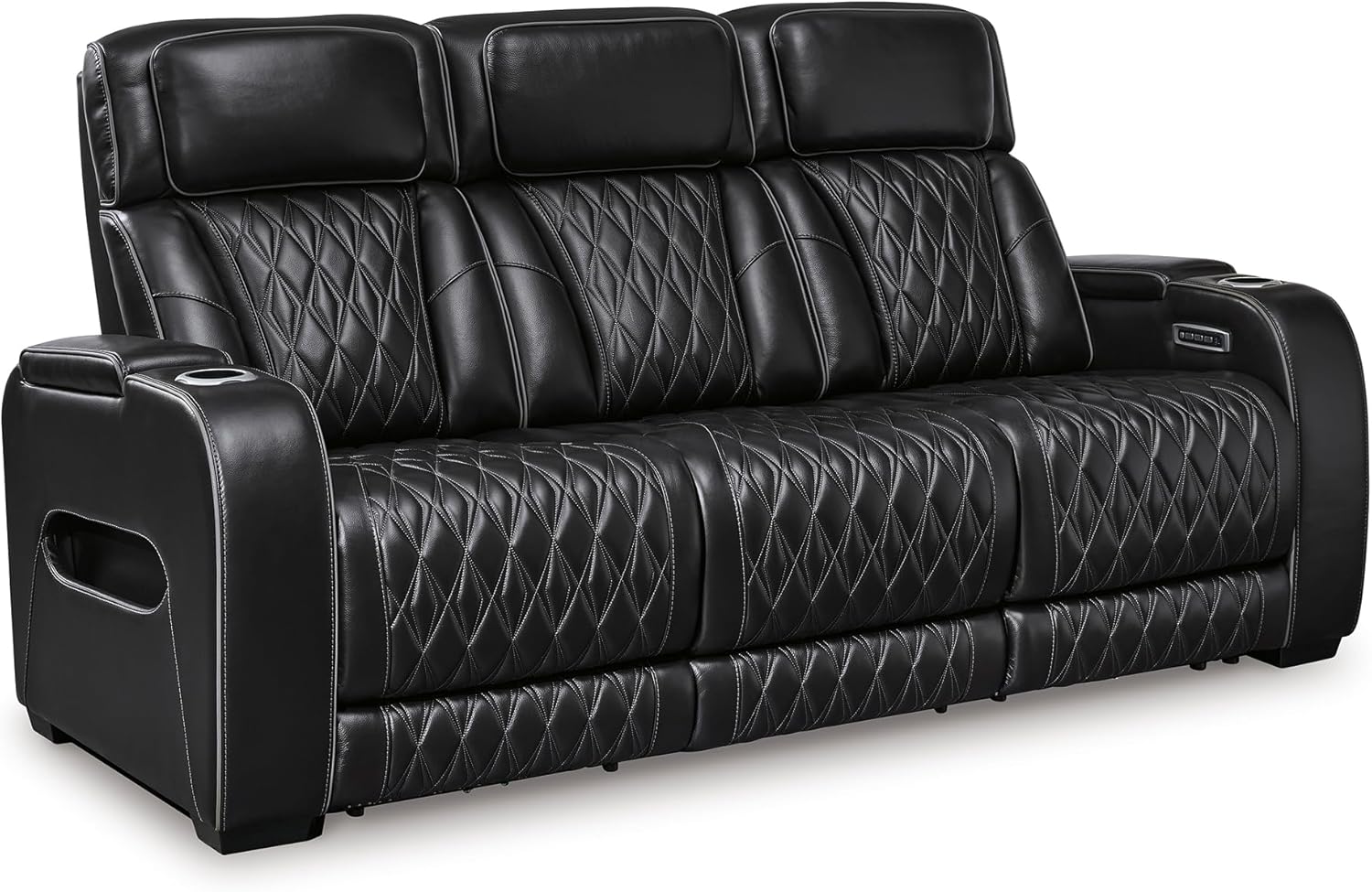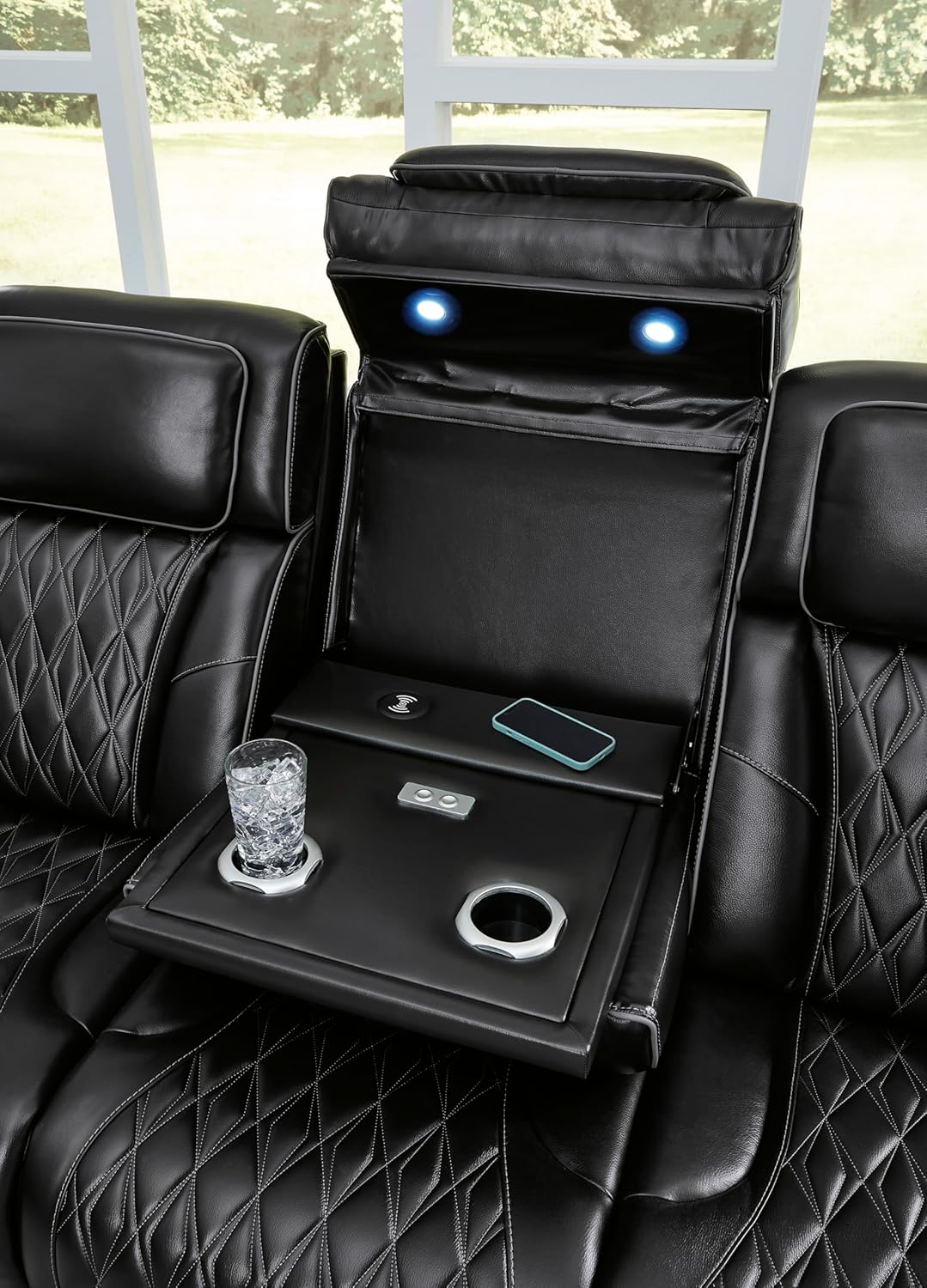 LOUNGE EFFORTLESSLY: Features one-touch reclining, adjustable headrests, air massage, heated seats and storage arms. Drop-down table includes LED reading lights, USB charging and cup holders
