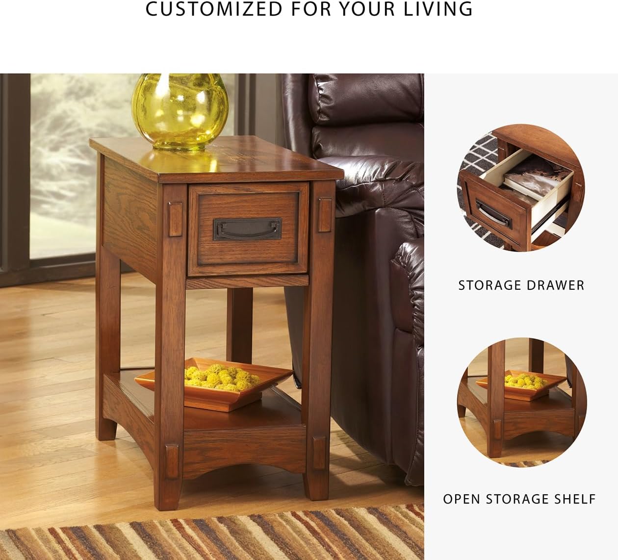 SPACE-EFFICIENT DESIGN: Chairside end table measures 13″W x 22″D x 23″H