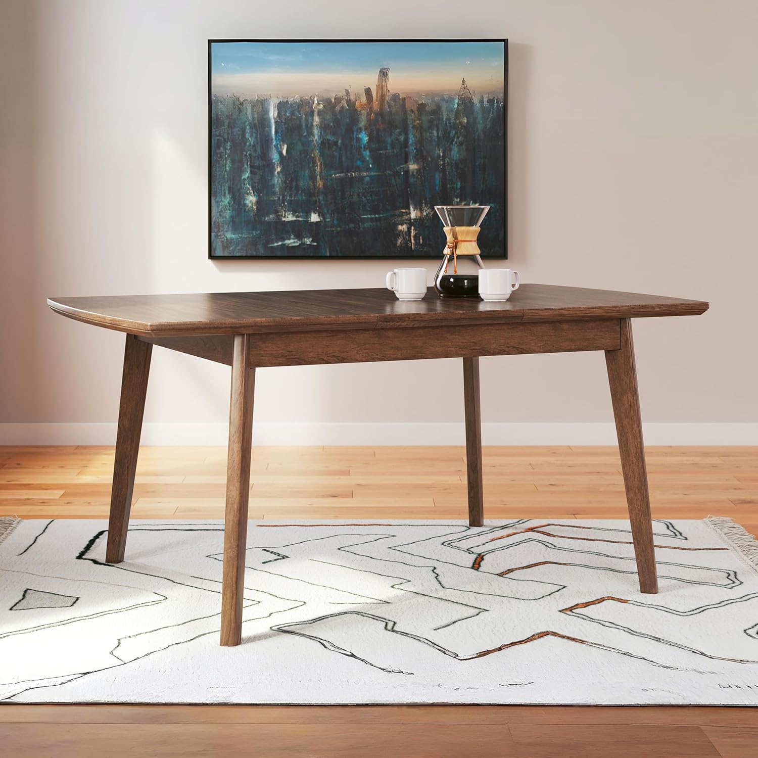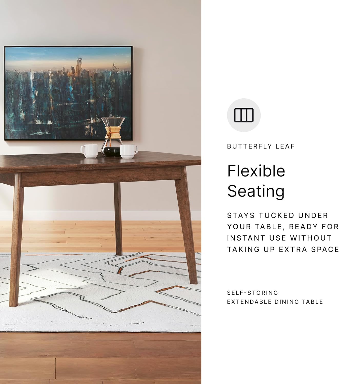 DINING EXTENSION TABLE: A refreshed take on retro aesthetics. This table adds an air of playful simplicity to your dining space, capturing the architectural language of mid-century stylings