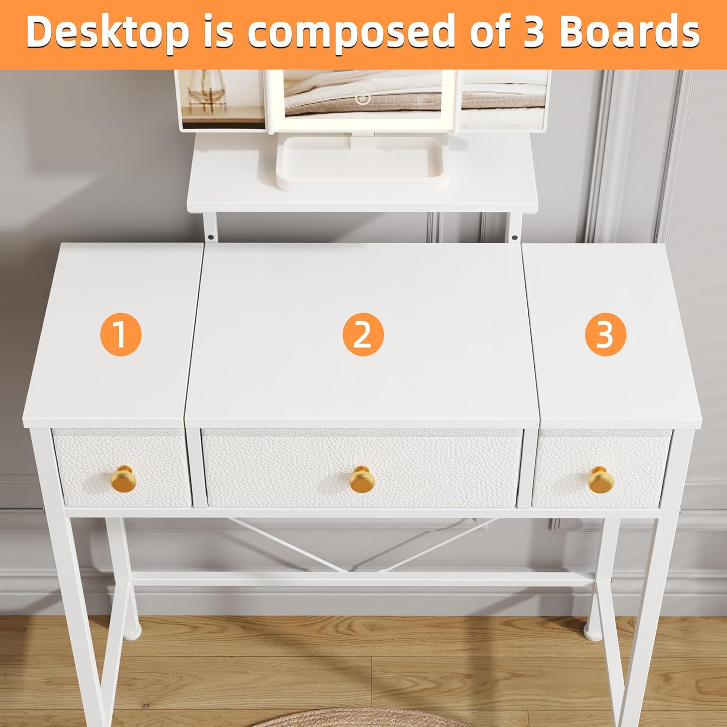 Small Makeup Vanity Desk with 3 Fabric Drawers, Vanity Table 11.8″ D x 27.5″ W with Mirror and Lights and Height-Adjustable Stand, Vanity for Girls Gifts, Bedroom and Small Spaces, White