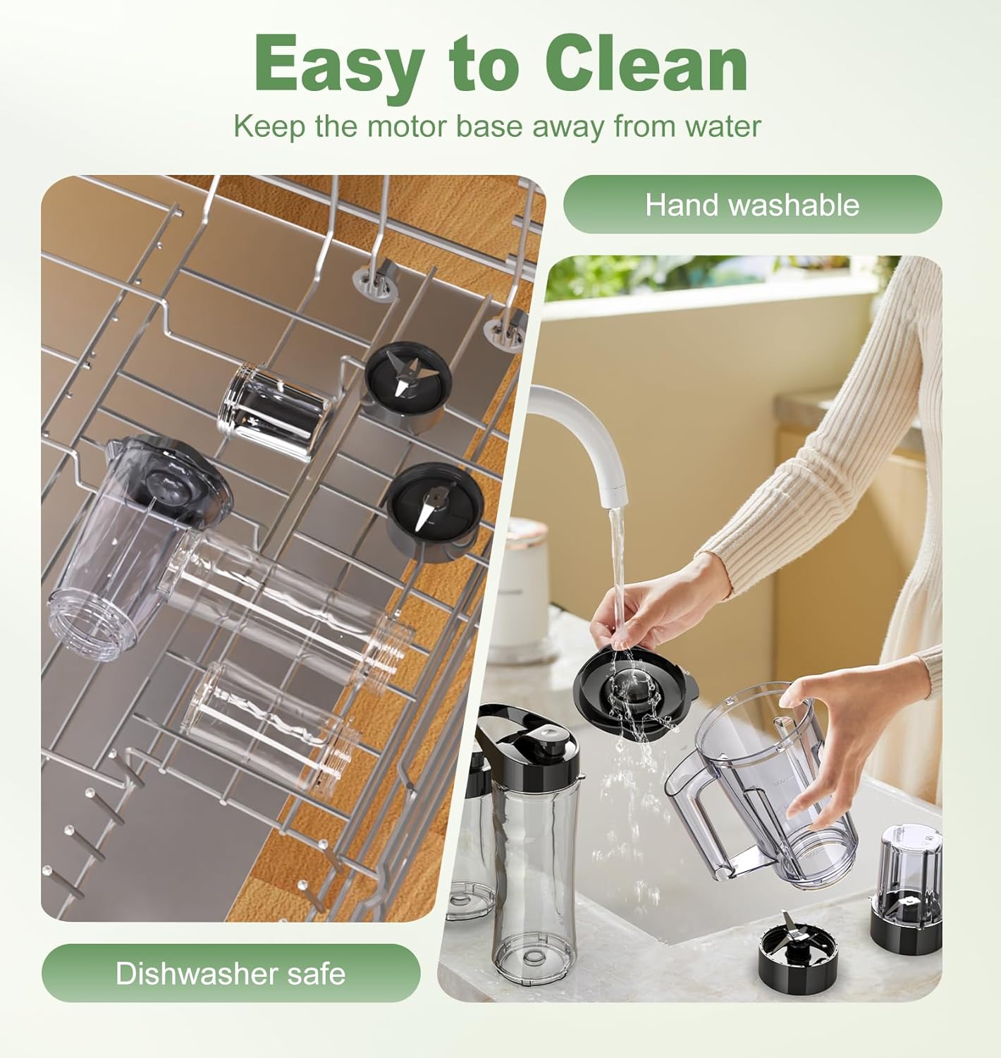 [Safe Materials, Easy to Clean]-All components are made from BPA-free, food-safe materials, ensuring no harmful substances are released during use. The detachable blade assembly and dishwasher-safe cups make cleaning quick and easy.