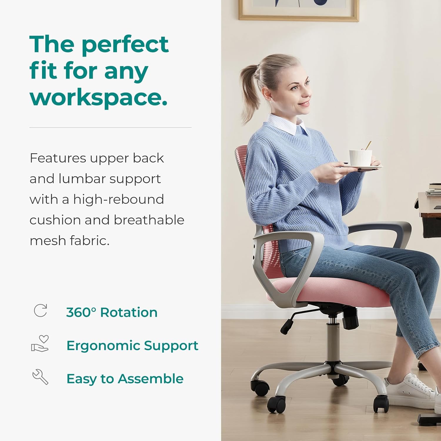 Smug Home Office Desk Chair – Ergonomic Mid-Back Computer Task Chair with Comfy Lumbar Support, Mesh Rolling and 360° Swivel, Flip-up Armrest for Home, Bedroom, Gaming, Study, Student, Pink