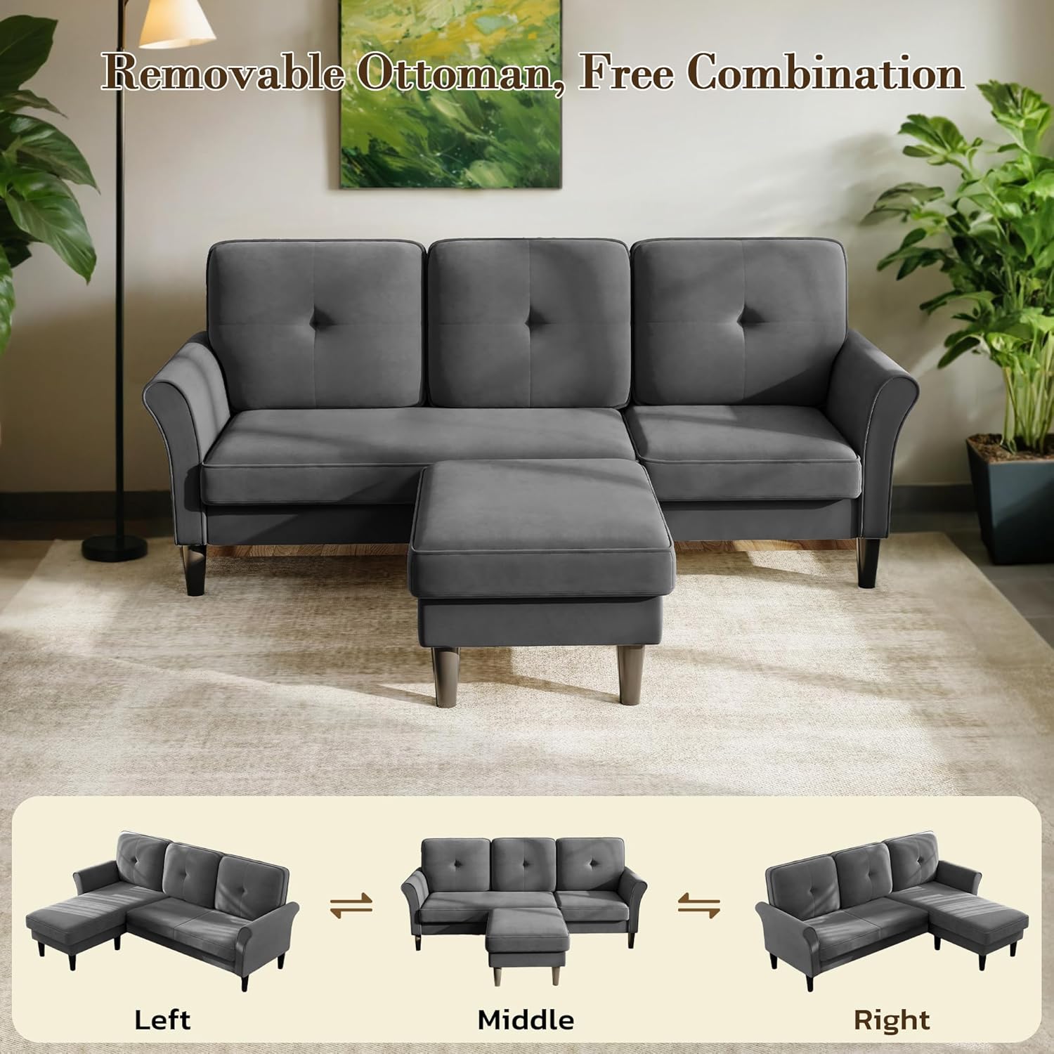 Sofas for Living Room, 83″ Velvet Sectional Couch with Moveable Ottoman, Midcentury Modern Small Sectional Couch, L Shape Sofa & 3 Seater, Couches for Living Room, Apartment, Bedroom, Grey