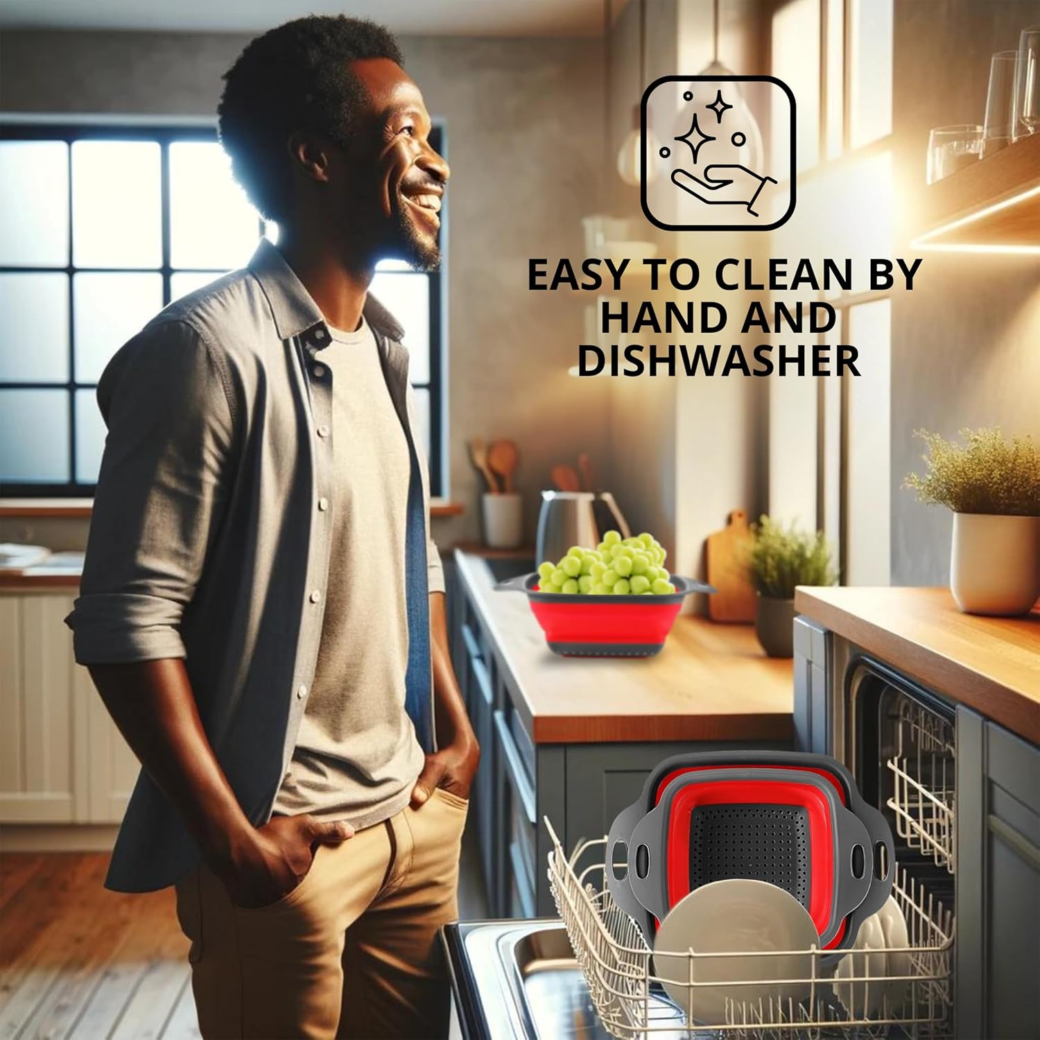 Square Collapsible Colander with Handles – Red Square Silicone Kitchen Strainers with Plastic Handles Foldable Kitchen Strainer Perfect for Draining Pasta Vegetable and Fruit Red
