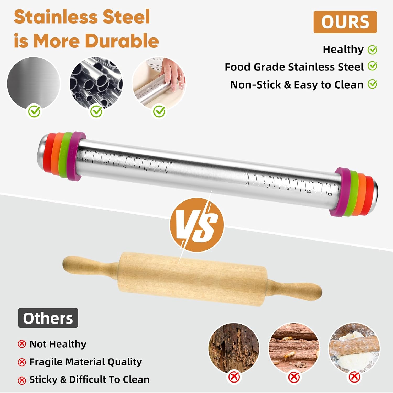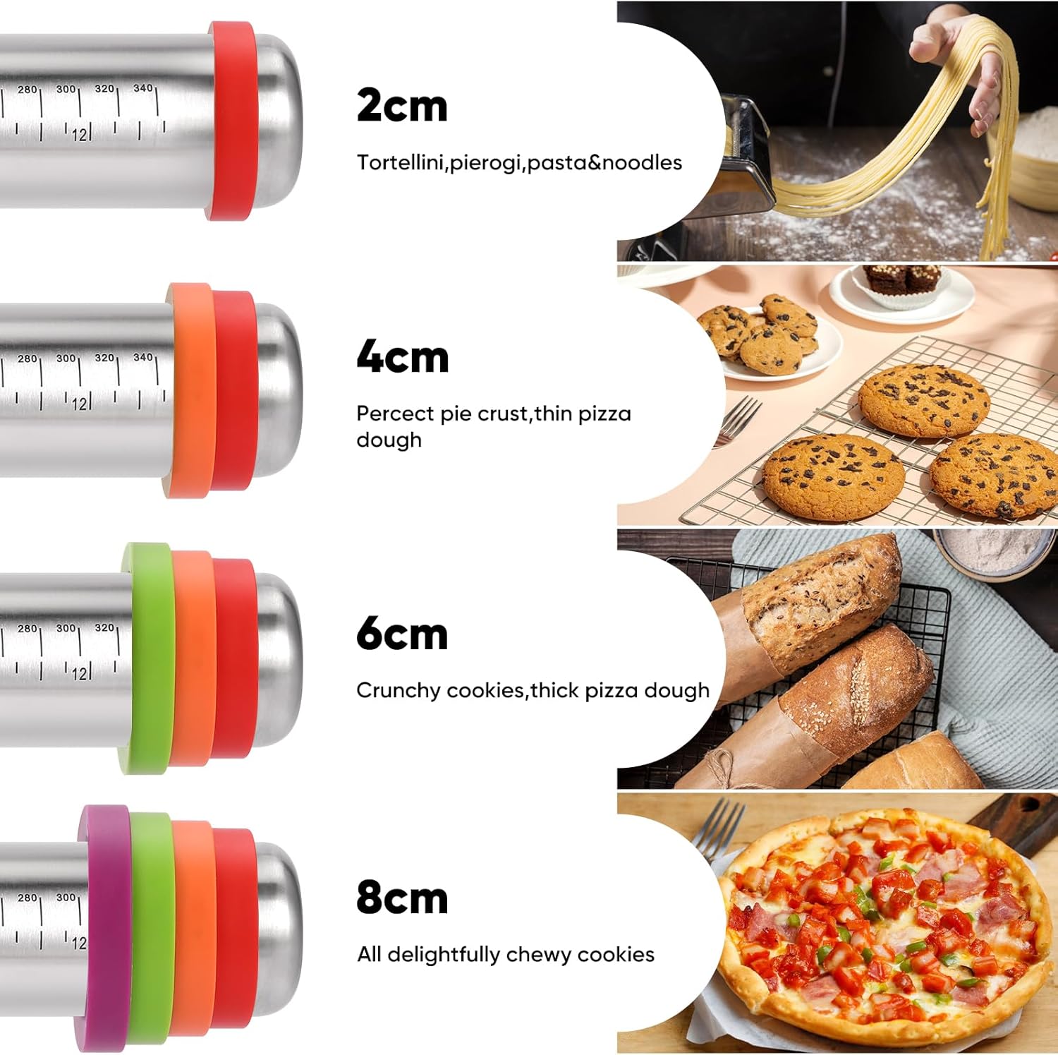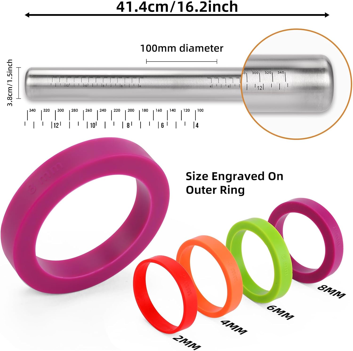 Stainless Steel Rolling Pin with Adjustable Thickness Rings – 4 Interchangeable Sizing Bands for Dumplings/Pasta/Cookies – Nonstick Kitchen Baking Tool (Rolling pin with color thickness rings)