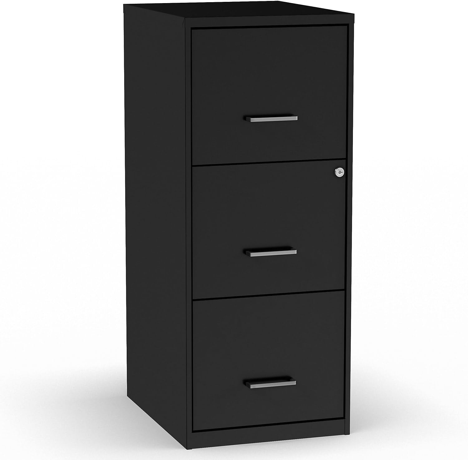 Keep important business records organized and close at hand with this three-drawer letter light duty vertical file cabinet. Ideal for workplaces of all sizes, this compact cabinet takes up minimal floor space and adds a contemporary touch to office decor with its sleek black finish and polished handles. The three deep drawers accommodate large numbers of letter-sized files and make it easy to organize office paperwork. This Staples letter vertical file cabinet keeps stored documents secure with a built-in lock.