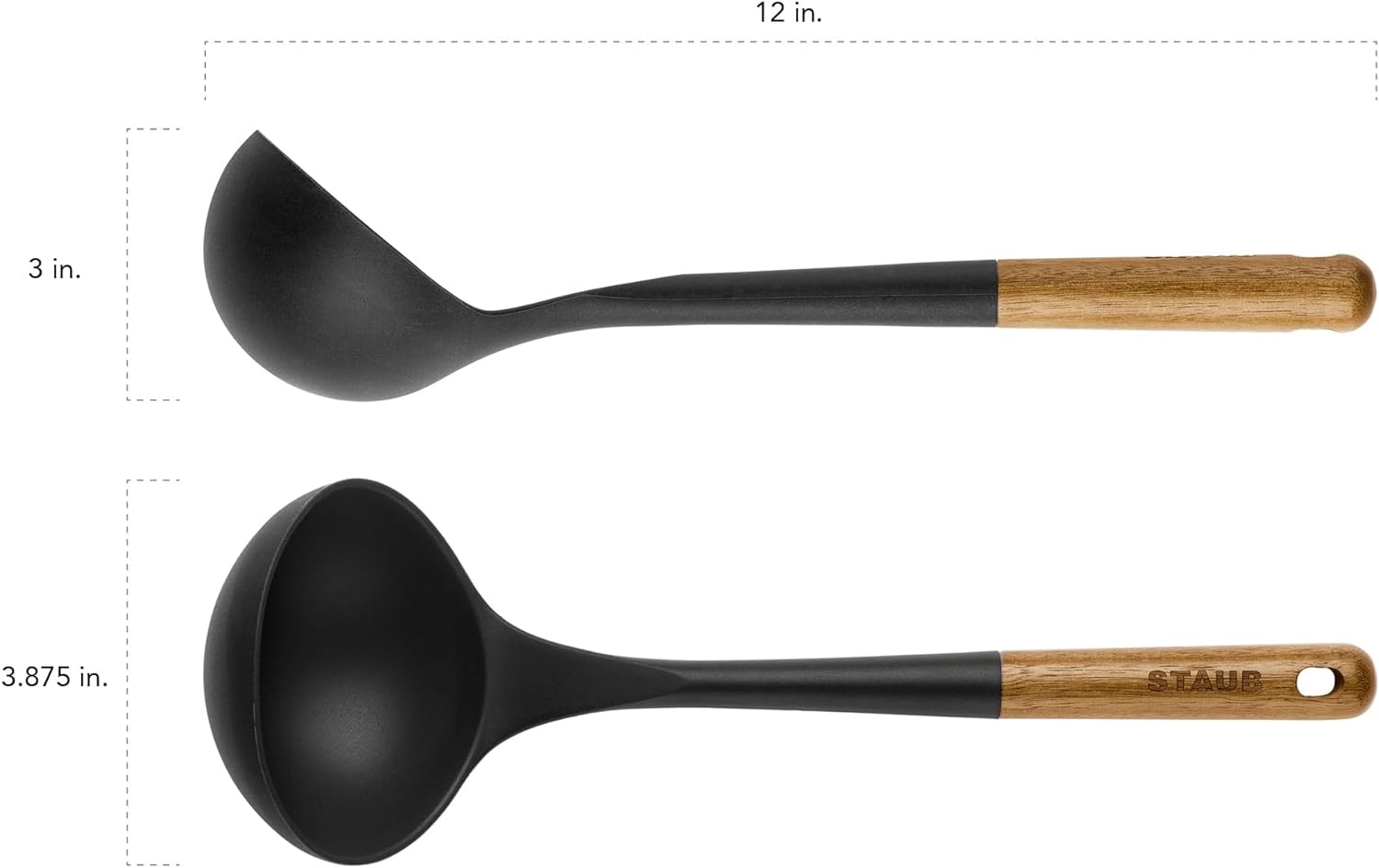 Serve hot soup, portion batter for pancakes, and sauce pasta with this versatile silicone soup ladle. STAUB silicone tools make the perfect registry or hostess gift for newlyweds, new homeowners, or the long-time STAUB fan. Beautiful and ergonomic, STAUB Tools are carefully contoured to fit comfortably in the hand so that you can effortlessly stir stews, skim soups, and flip steaks. Each tool is made from ultra-durable, BPA-free matte black silicone that’s resistant to high temperatures and safe to use on all cooking surfaces, including nonstick. The sleek silicone is complemented by handsome Acacia wood handles each featuring a unique wood grain pattern. And their handy hanging loops ensure easy storage.