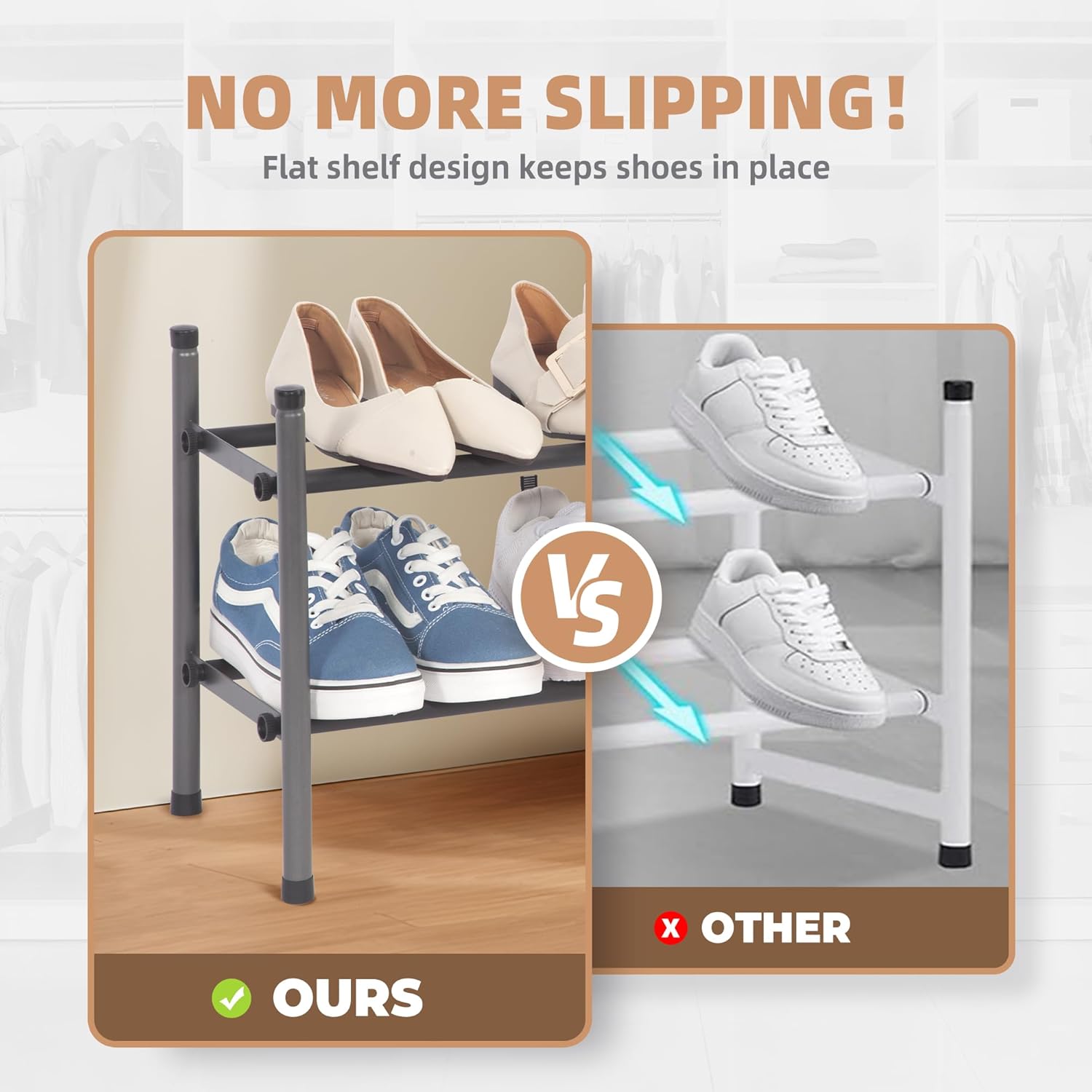 EXPANDABLE – The expandable shoe rack extends from 17.7″ to 32.3″, allowing you to adjust the length freely based on your available space. For larger areas, our extended version (ASIN: B0F32532MB) expands from 33.3″ to 47.5″.