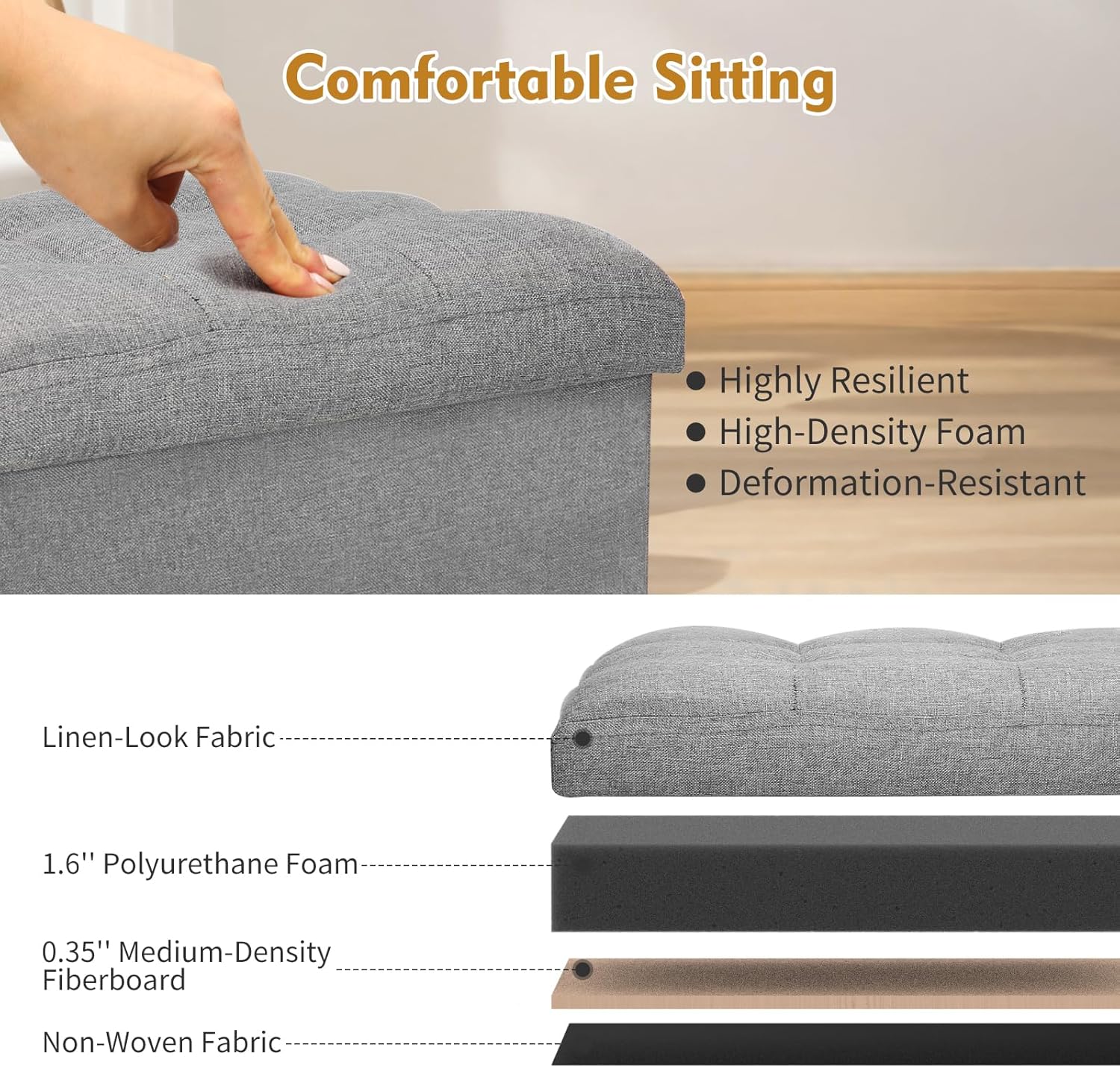 【Sturdy & Durable】Storage ottoman is made of high quality fine linen-look fabric with fine stitching and beautiful atmosphere. Built with durable MDF, this folding ottoman supports up to 300 lbs. Its solid structure makes it ideal for sitting, standing, or even using as a step stool, ensuring long-lasting stability and utility.