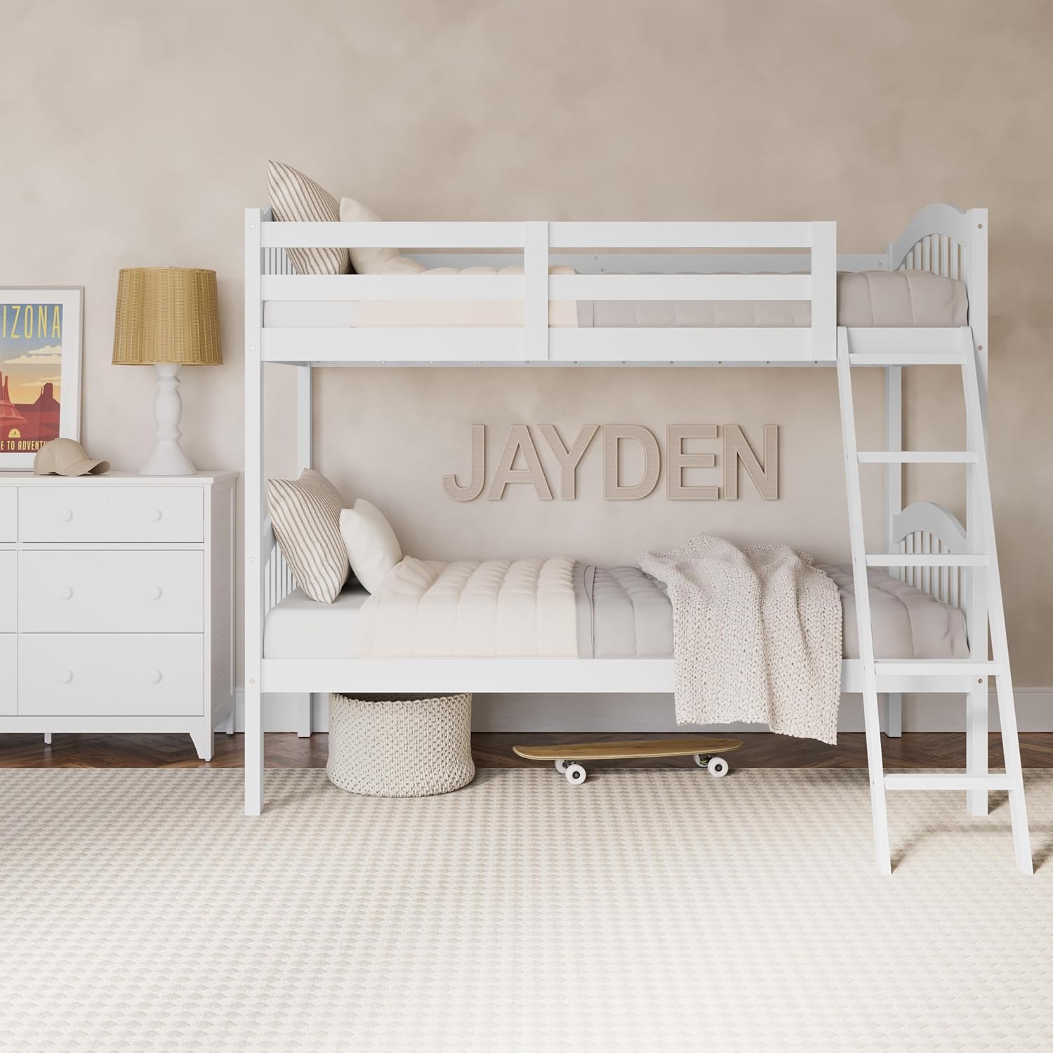 TWIN OVER TWIN BUNK BED FOR KIDS: Twin over twin bunk bed with ladder; Convertible bunk bed can be transformed into 2 individual twin beds for maximum versatility; Designed to fit any standard twin mattress (mattresses not included); Assembly required