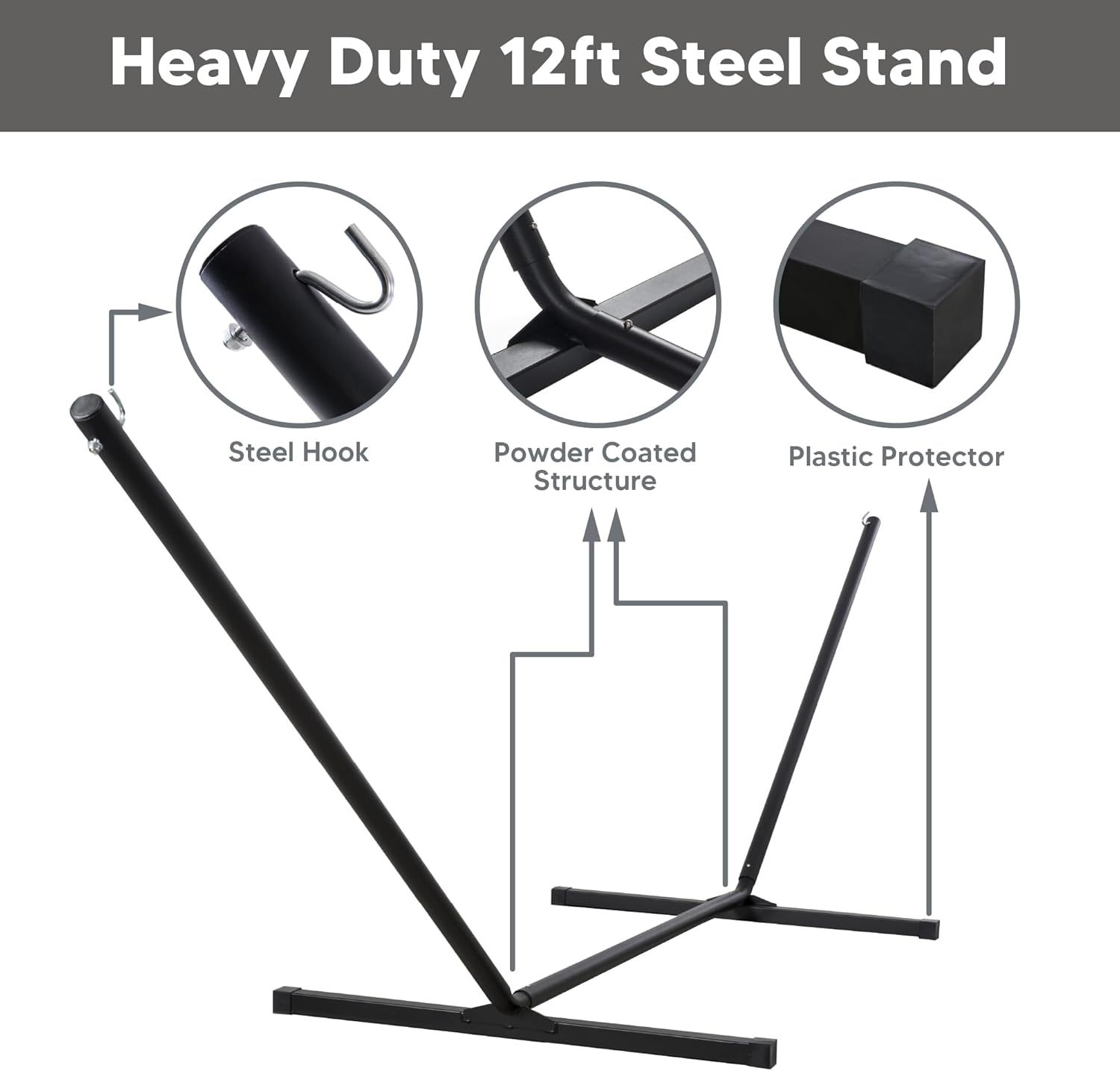 Hammock with Portable Stand: No damage to trees. Created to be stable and long-lasting, the 12 ft stand is made from powder-coated heavy gauge steel. It can be easily assembled in minutes without any tools, and it could be disassembled easily, making it to be a portable hammock. Feel free to contact us if you have any questions during use within one year of purchase. We are always here to help