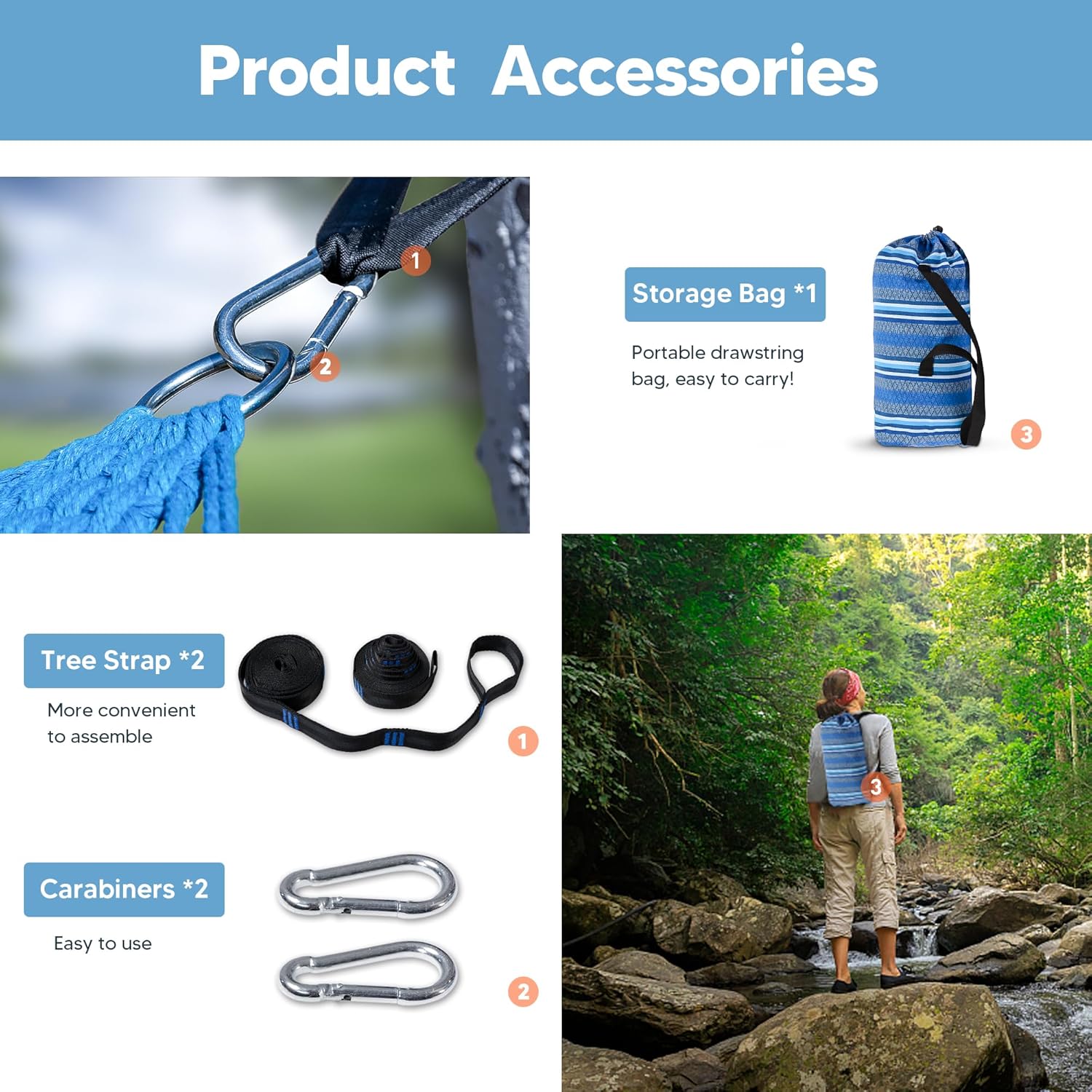 Portable & Easy to Use: The new splicing spreader bar could be knocked down within minutes, and it comes with a drawstring bag, which makes the outdoor hammock portable. The two person hammock will be more convenient to assemble thanks to its hanging kit (2 pcs of 9.84 feet tree straps and 2 pcs of carabiners). Enjoy the relaxing swing with your significant one at beachside, patio, backyard, balcony and more
