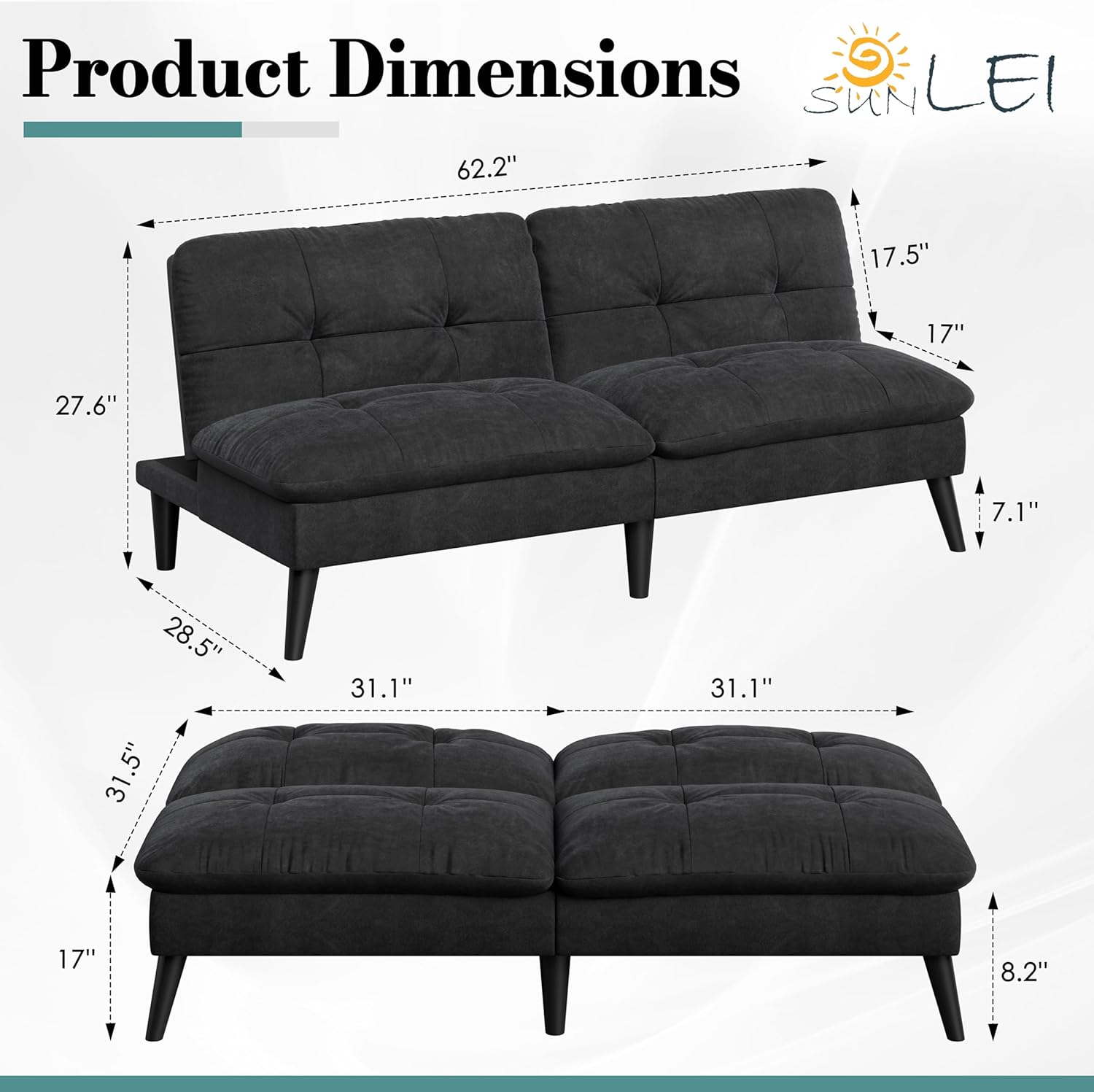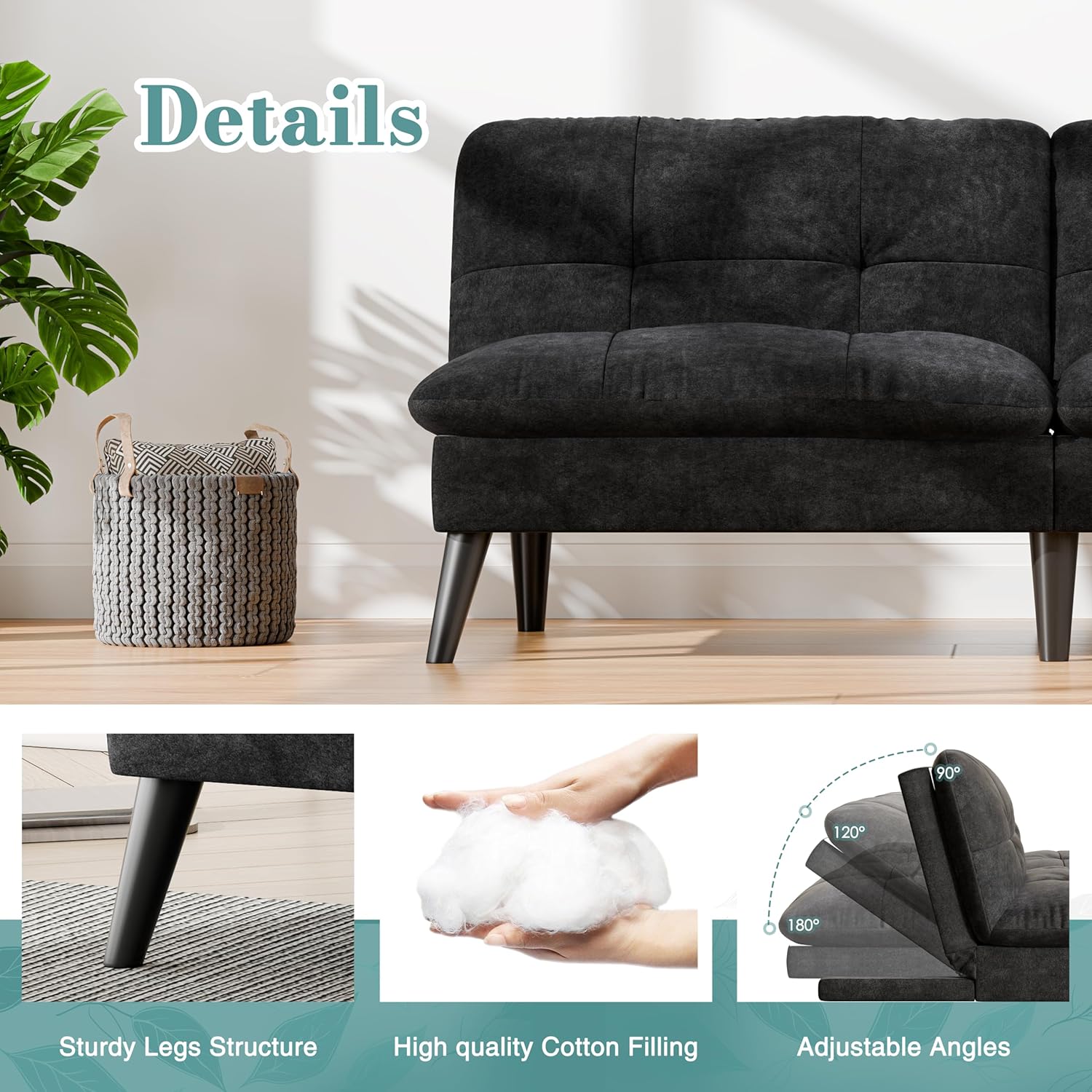 [Extra Support Base] – The additional legs of the futon couch are made of sturdy and tough materials that can withstand heavy loads. When you turn the cushion sofa bed, you can see the two base legs in the middle of the bottom side.