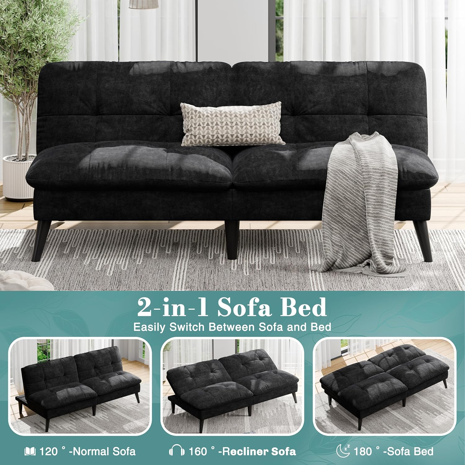 [Convertible Design]- The unique design of this sleeper sofa enable you to You can turn the couch mode into the bed mode within just seconds by simply pressing the backrest forward and pull them back due to the special iron frame.
