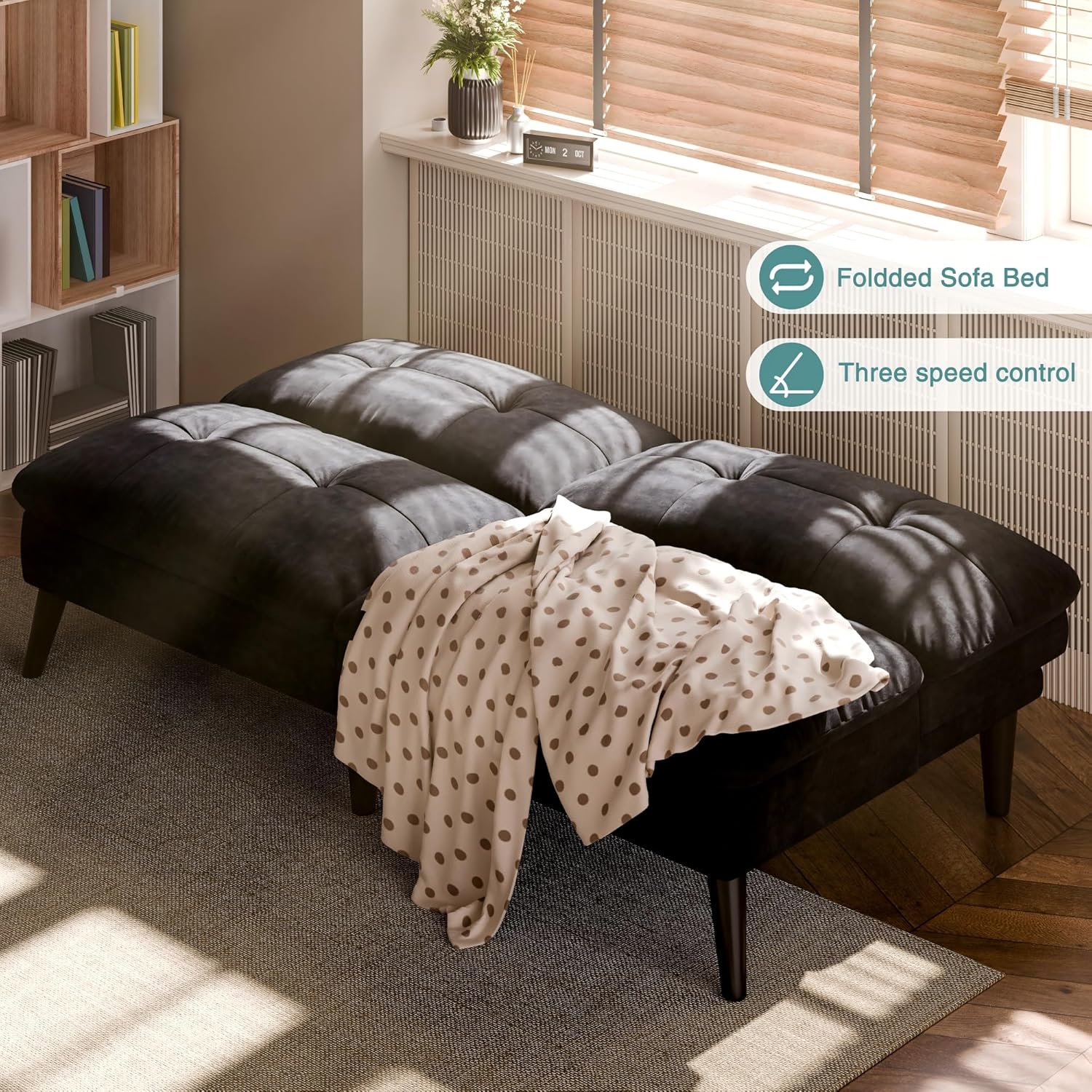 SUNLEI Small Futon Sofa Bed, Folding Futon Bed Sleeper Couch Recliner for Living Room, Convertible Cloud Sofa Couch with Adjustable Backrest for Apartment or Office, Black Velvet