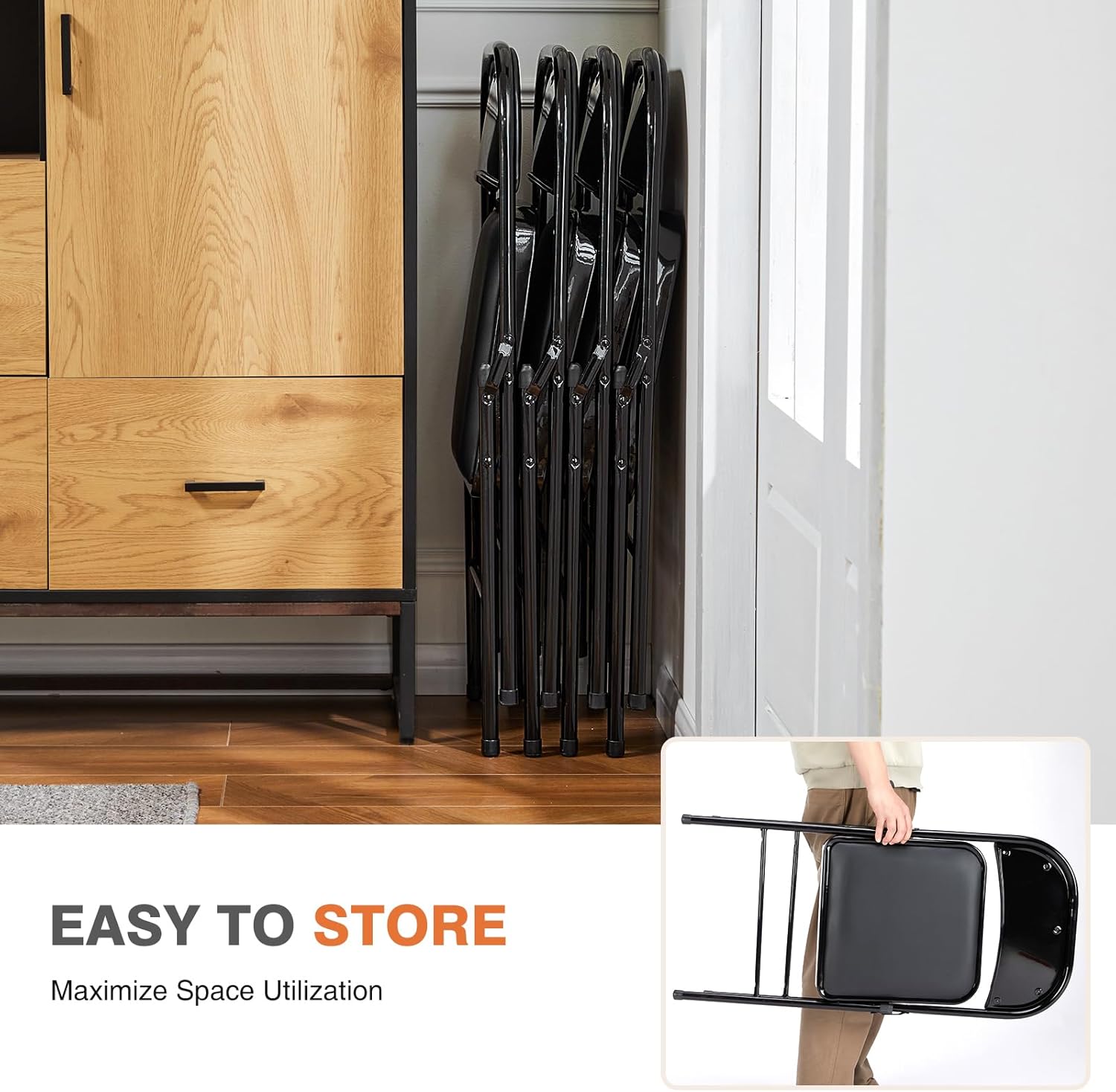 【Superior Comfort】The folding chair’s backrest and seat cushion feature high-density sponge padding, providing exceptional comfort for you or your guests. The premium quality PU leather used gives an excellent touch and provides an impressive sitting experience, making this chair soft and comfortable yet durable and easy to maintain.