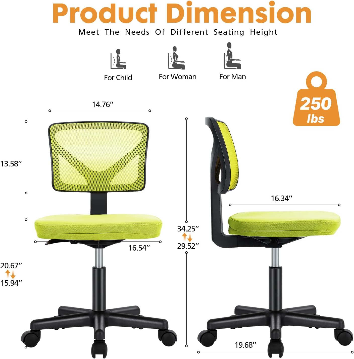 【Comfortable Armless Office Chair】 No armrests, no limits, flexible and space-saving, the chair is suitable for kids and teens and is also friendly to adults. This low-back small office chair with a foam molded seat can also be a task chair. Besides, this armless office chair has a mesh back for the most comfort. The advanced armless office chair with an ergonomic design will bring you a first-class sitting experience.