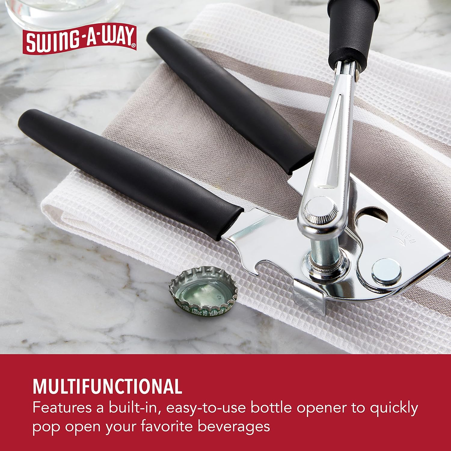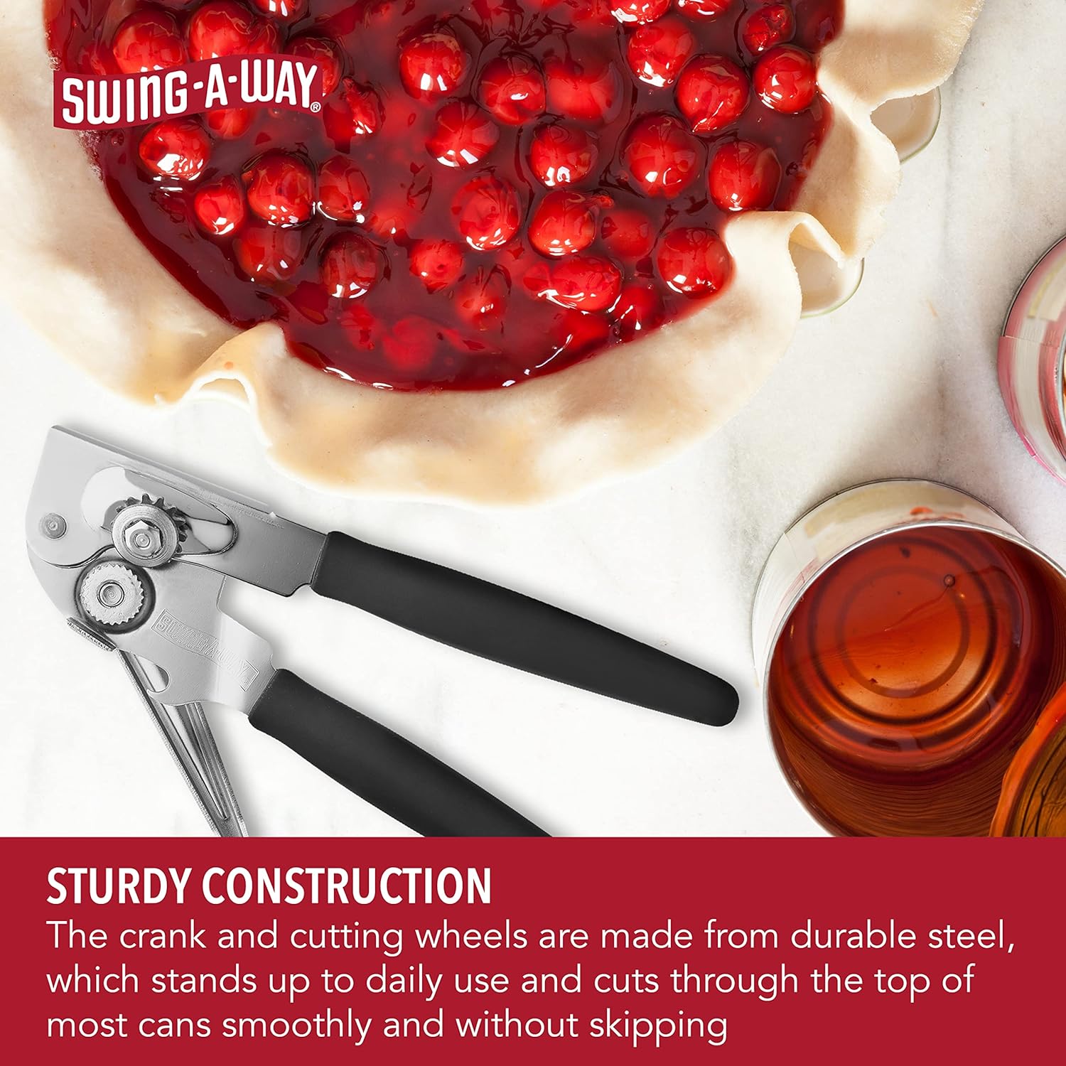 EASY TO USE WITH COMFORTABLE HANDLE: The Swing-A-Way Can Opener features an extra-long crank handle for a better grip; helping take the strain and pain from your hands when in use. The crank folds down, making storage easy.