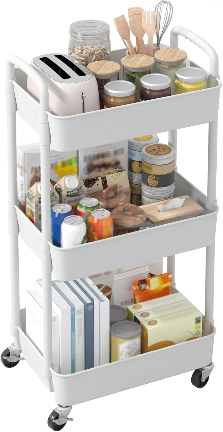 Sywhitta 3-Tier Plastic Rolling Utility Cart with Handle, Multi-Functional Storage Trolley for Office, Living Room, Kitchen, Movable Storage Organizer with Wheels, White