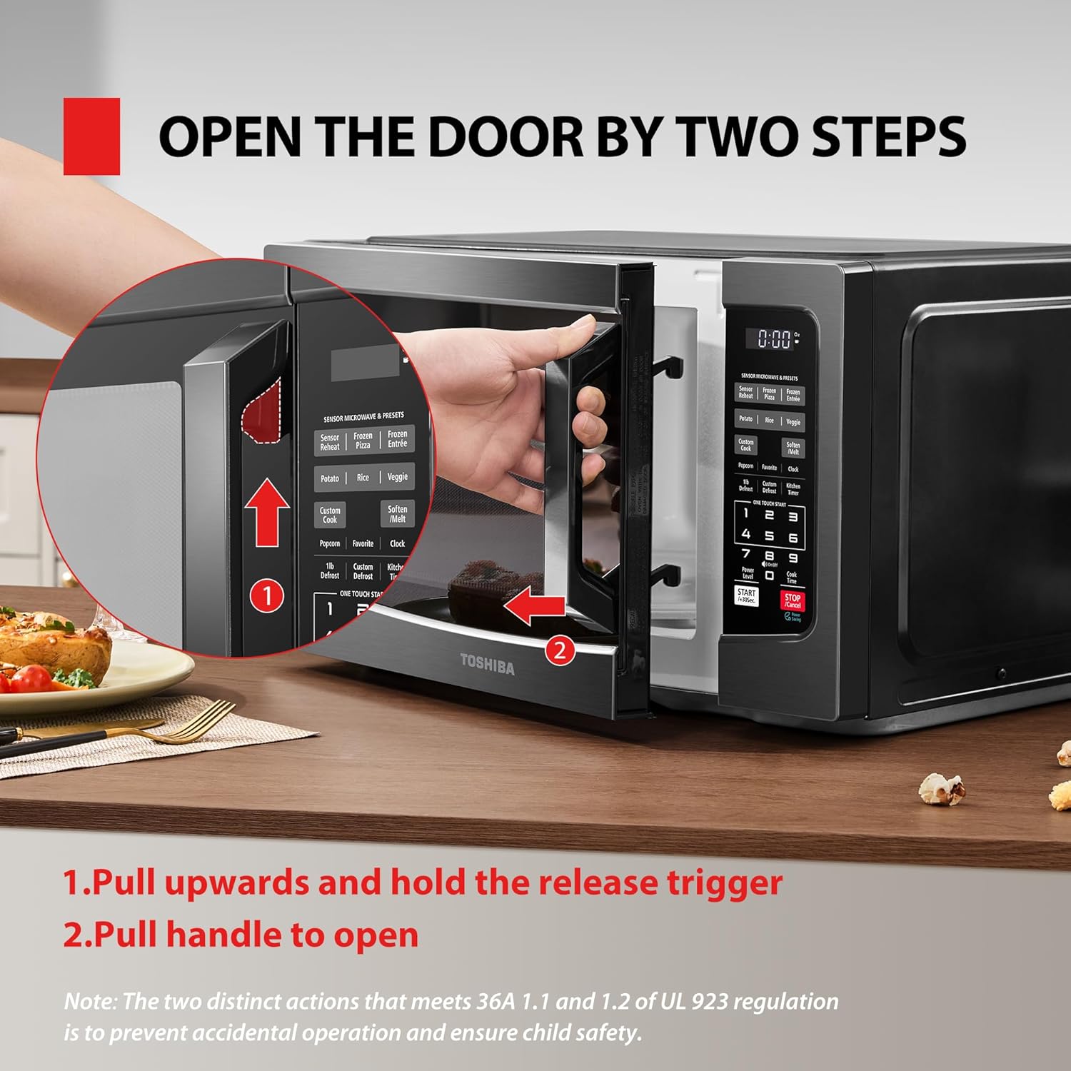 This Toshiba 1.2 Cubic feet 1100-watt Black Stainless Steel microwave is the ideal size for apartment kitchens or office break rooms. Sensor reheating lets you optimally cook six of the most popular food items with the touch of a button. Choose from ten power levels up to 1100 watts. The large digital display has a clock function and can also display a countdown timer as well as the cooking time remaining. Program up to three favorite time and power combinations for additional one-touch convenience. Easily open or close the microwave with the large, easy-to-grip door handle. The Black Stainless Steel exterior looks good in any kitchen. The microwave can be turned on for one to six minutes at 100 percent Power by simply touching the number of minutes you would like to cook. If cooking time is needed while the microwave is running, press the start button to add an additional 30 seconds of cooking time.