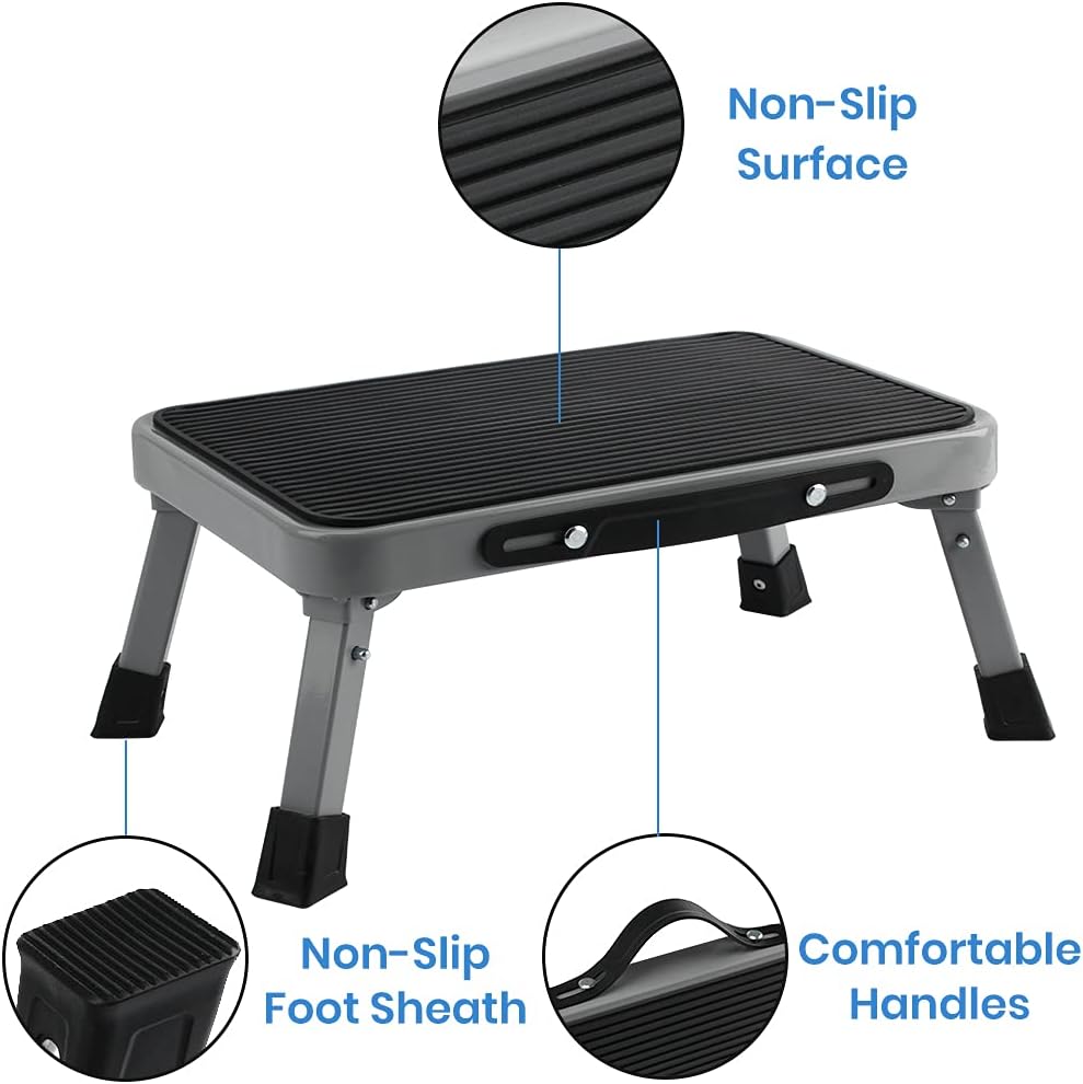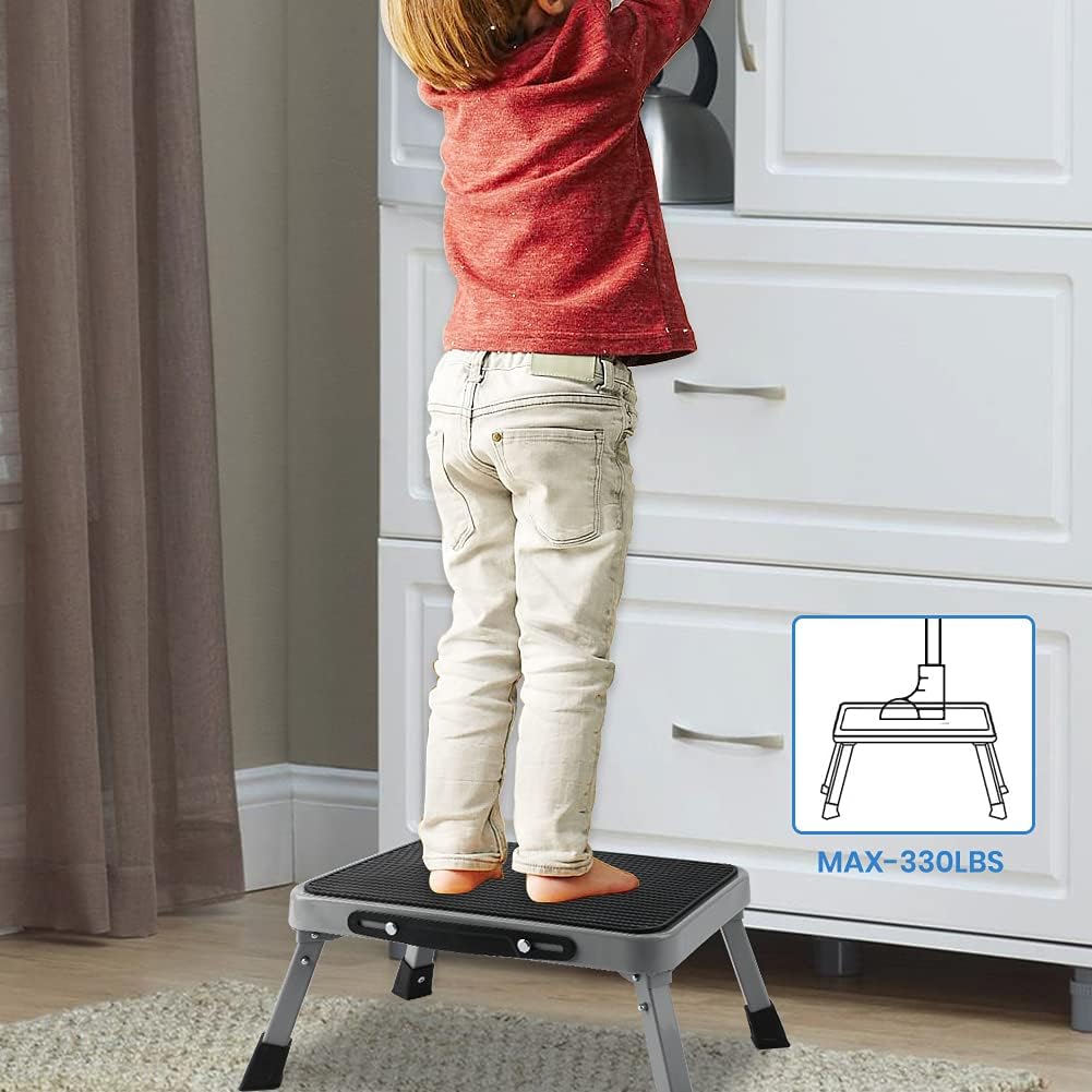 Durable/Safety▲: Sturdy kitchen step stool have 4 secure and stable legs, load capacity up to 330 lbs,foot Stool has a ribbed vinyl plastic black surface for better grip in order to prevent falls.