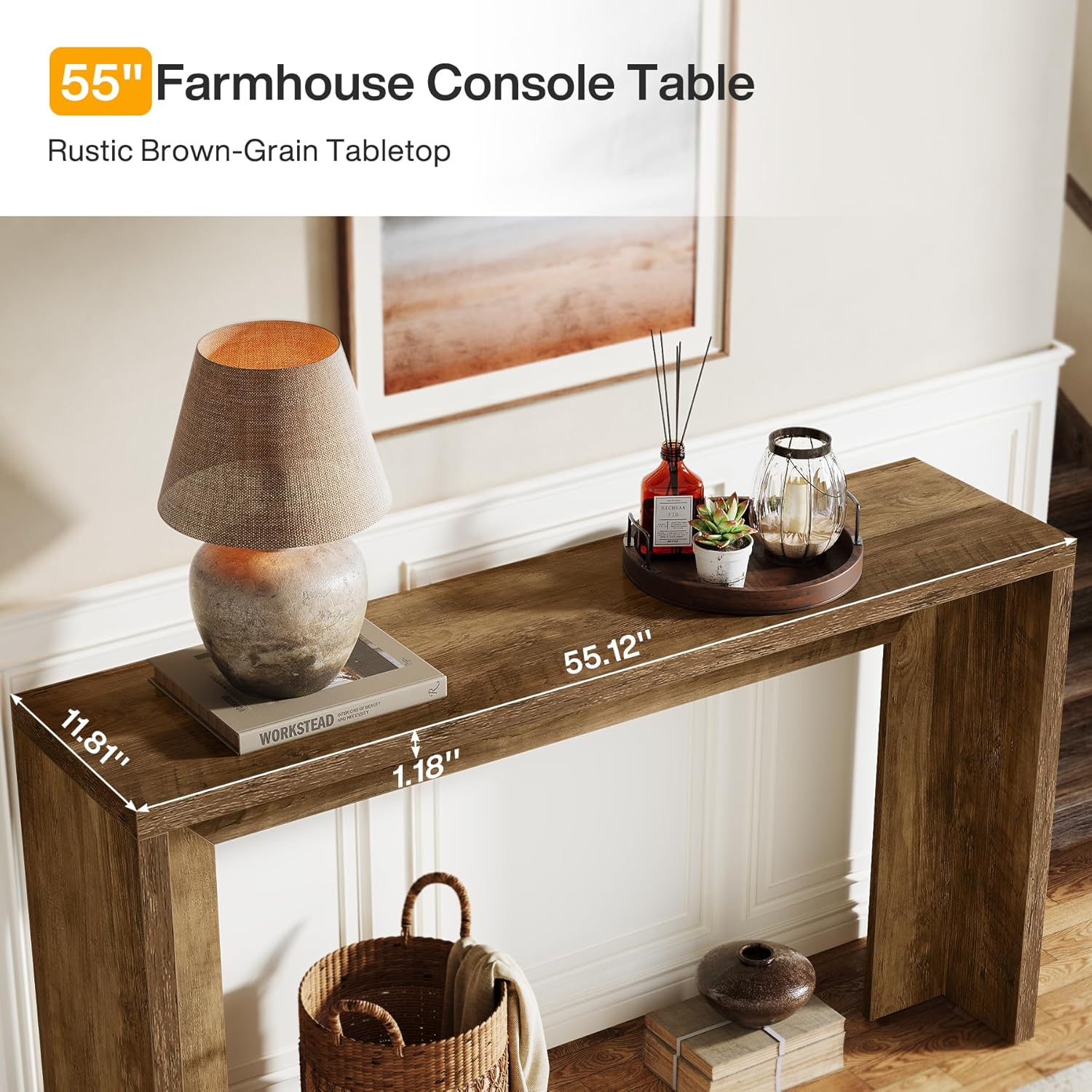 Efficient Storage: The 55-inch spacious top is ideal for displaying decor, photos, or vases, while the open design beneath provides ample space for baskets or boxes, keeping your space organized and clutter-free