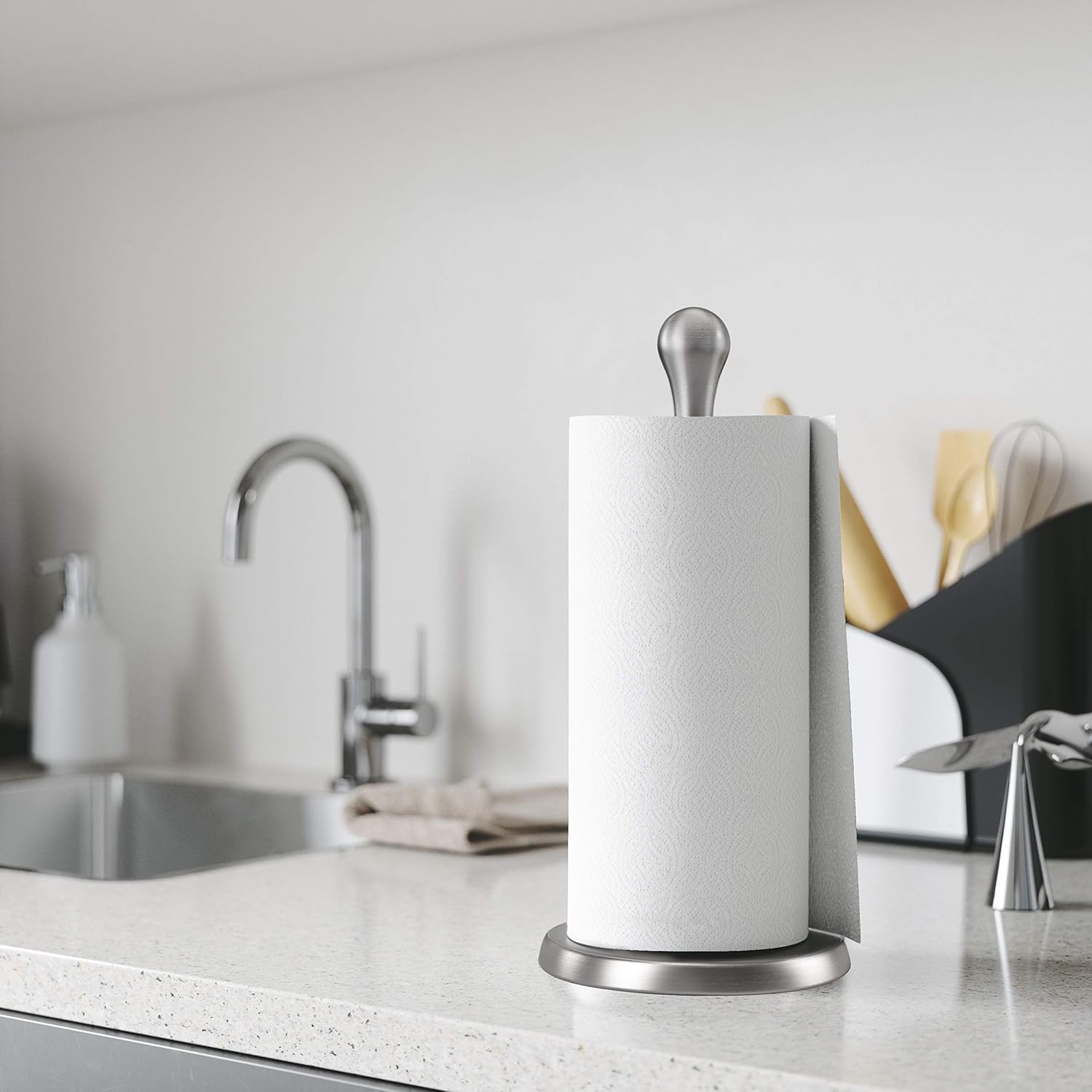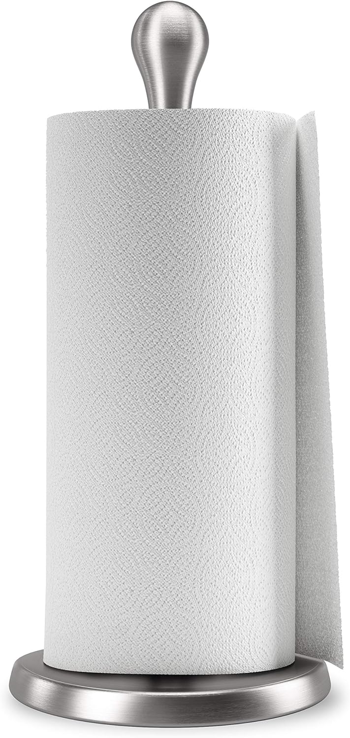 WEIGHTED BASE FOR ADDED STABILITY: Umbra Tug Paper Towel Holder features a weighted base to help prevent it from toppling over and ensure it stays firmly in place when you tear off a sheet of paper towel