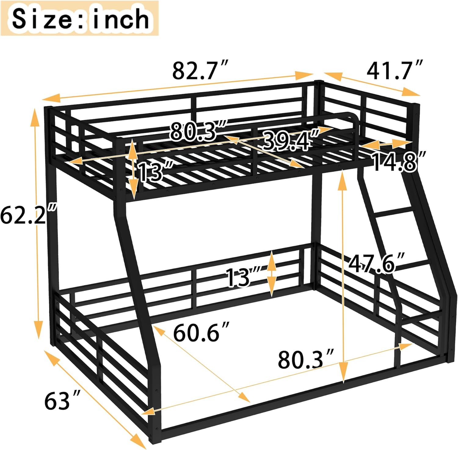 🥇🥇【Twin XL over Queen Bunk Bed: Safety】The safety of this metal bunk bed twin XL over queen is certified by Children’s Product Certificate (CPC). The heavy duty metal bunk beds come with one build in ladder and heightened guardrail. Reinforced ladders make it safer for children to climb up and down. Low bunk design increases the activity space between the upper and lower beds, not easy to bump the head.(47.6″ height between the upper and lower bed).