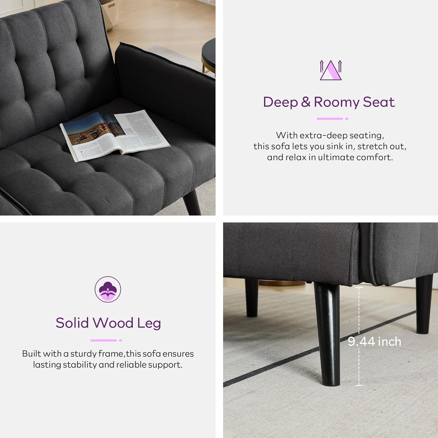 【Quality Craftsmanship You Can Feel】We don’t just promise comfort; we built it to last. The ‘loveseat sofa’ is cloaked in a soft, skin-friendly fabric that is as easy to maintain as it is on the eyes. Supported by a solid wood structure and sturdy oak legs, your investment is grounded on a solid foundation designed for durability