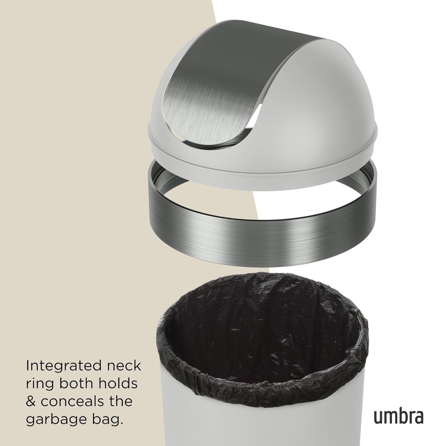 SIMPLE CLEAN DESIGN: Venti has a simple yet effective design that looks great with any decor; the swing-top lid keeps garbage out of sight while the neck ring both holds and conceals the bag for a clean, modern look