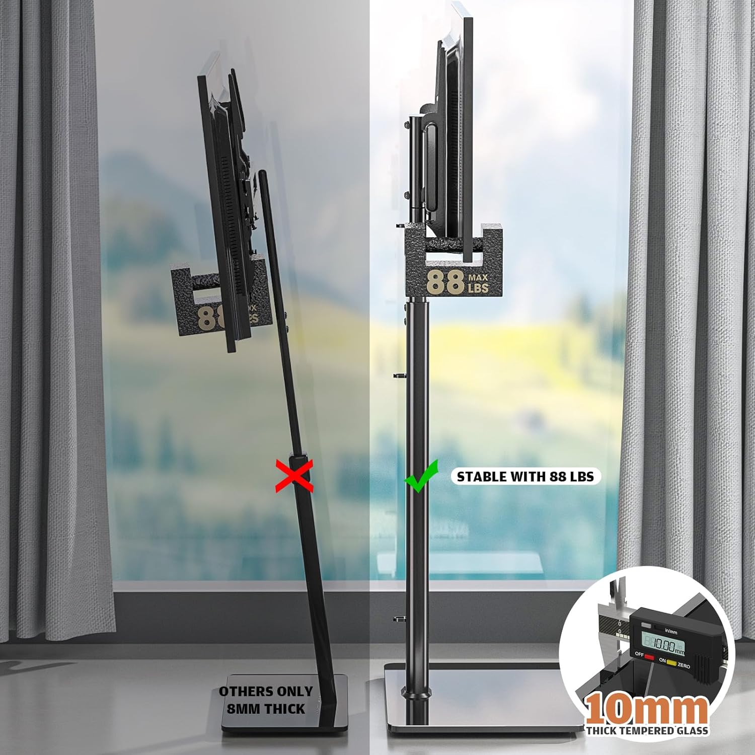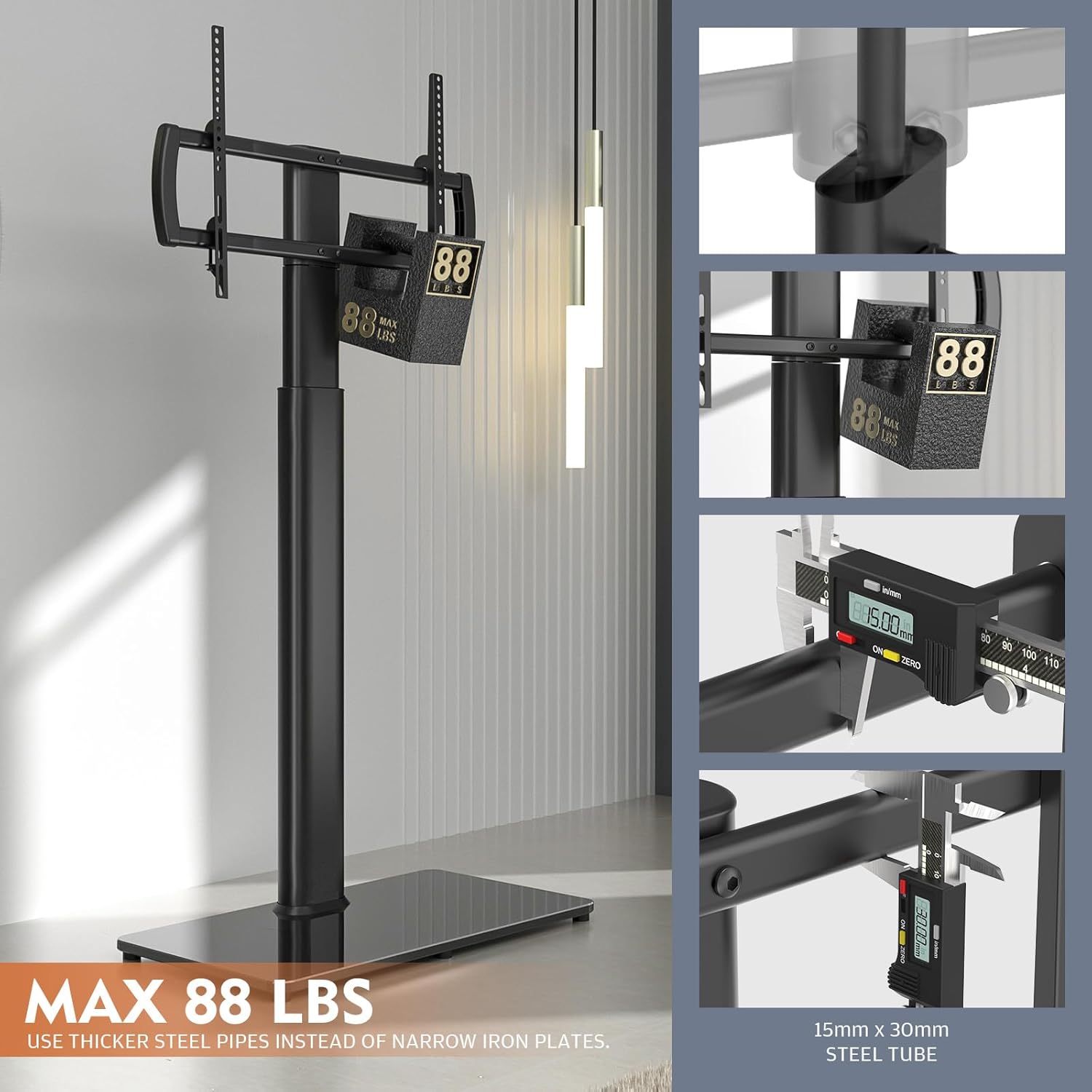SMART DESIGN ☞ This smart floor TV stand comes with 10mm solid tempered glass base that connects to a solid steel pillar which provides stable support for your TV that creates a modern look for your audio video equipment, it can hold up to 88lbs