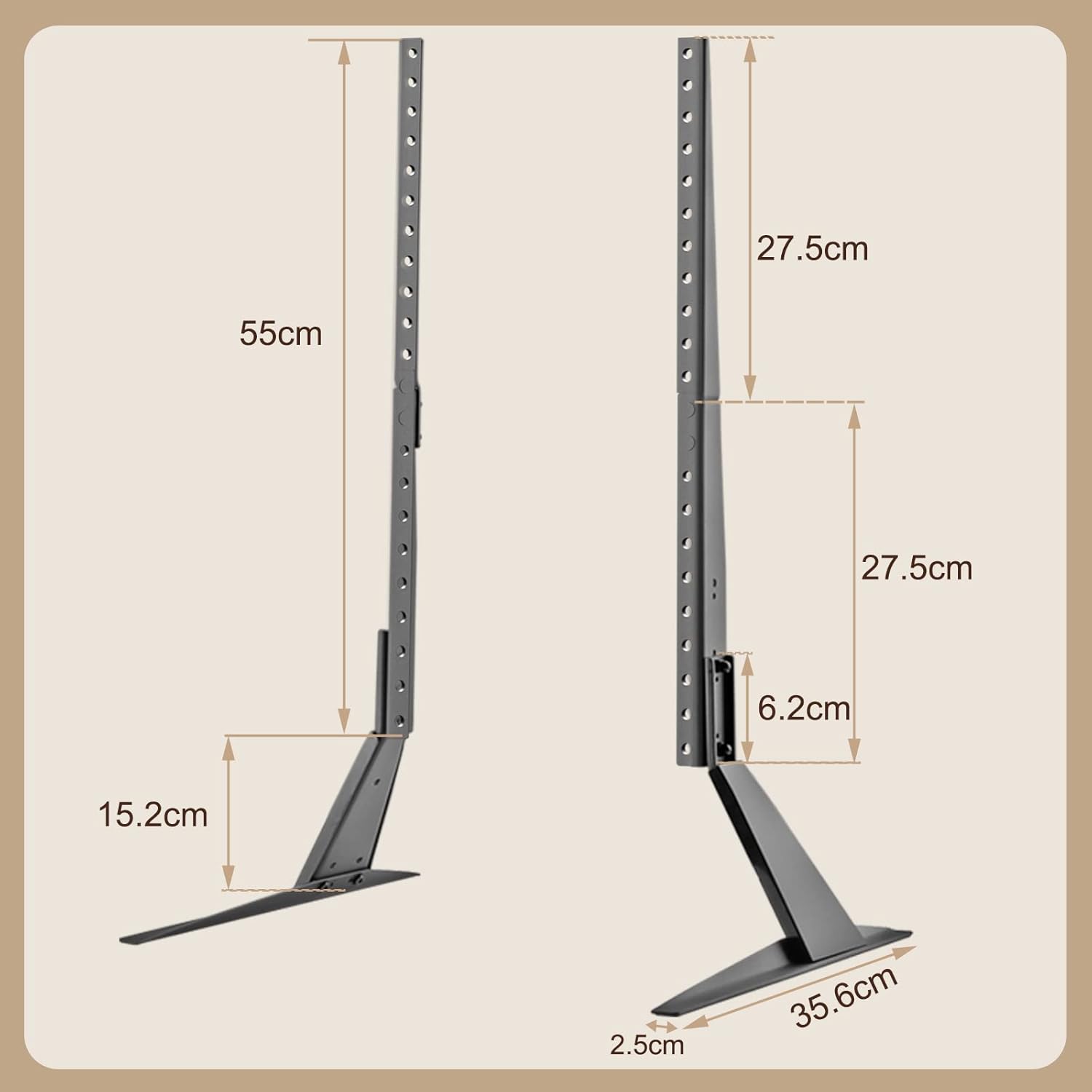 Fits 20-65 inch TVs.Holds up to 50kg.VESA 75×75mm to 800×500mm.2 level height adjustable.3mm feet soft pad on base prevents scratching of floor or cabinet surface.