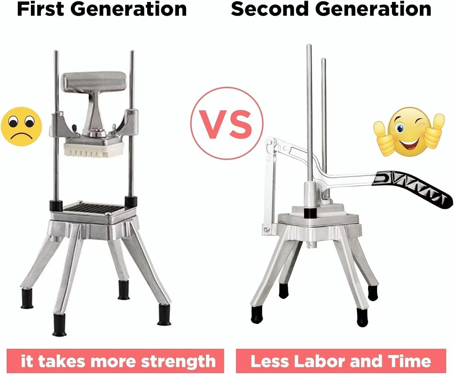 Ergonomic Handle:The second-generation upgraded version of the Veggie Dicer is more labor-saving than the old one. Unique push-type handle design with higher efficiency can save more time from mechanized work.You can easily press the handle to cut the vegetables and fruits over the sharp blades. It is convenient to prepare French fries and vegetable salads with a commercial chopper without effort.