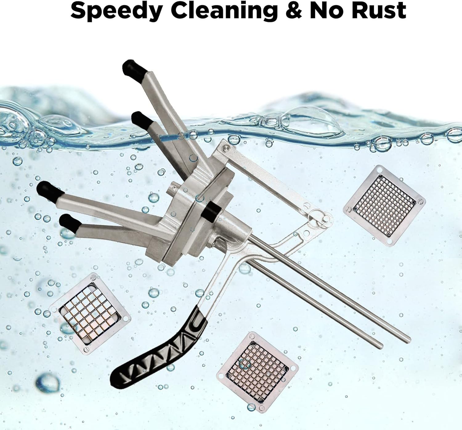 Upgrade Stainless Steel Vegetable Cutter: Ideal for potatoes, tomatoes, peppers, mushrooms.3 Replacement Blades (1/4″, 3/8″, 1/2″) for various widths. Doubles cutting efficiency.