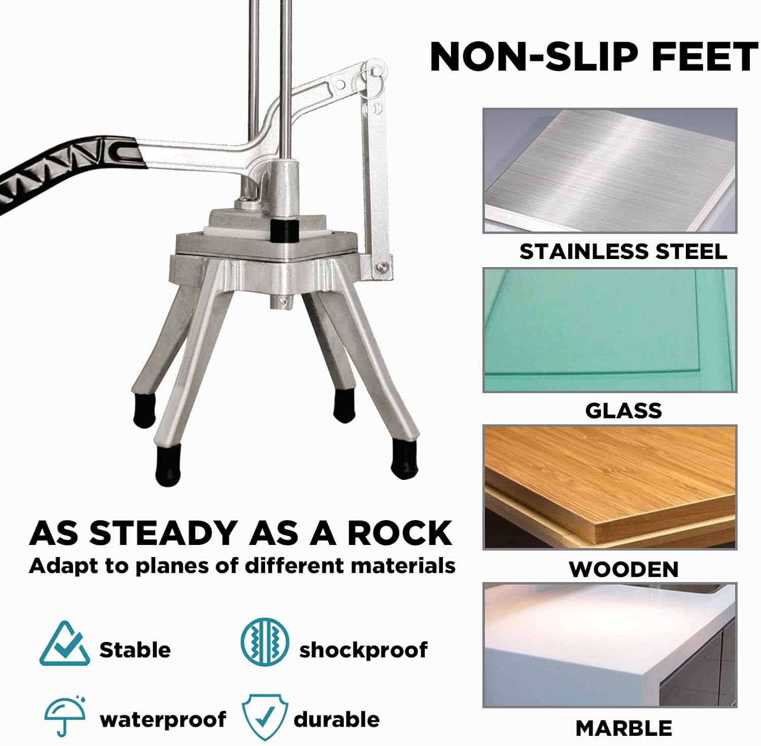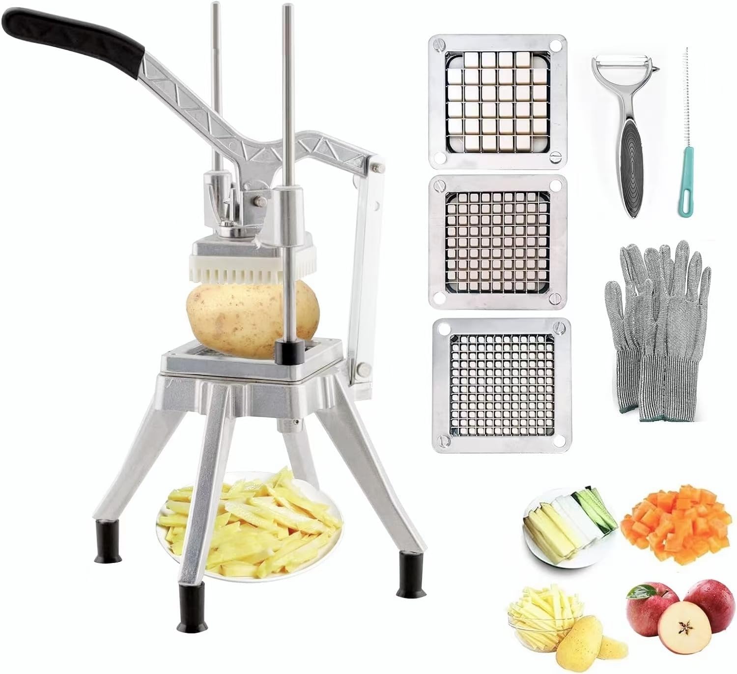3 Blades Available:The sturdy commercial potato cutter is equipped with 3 sharp blades 1/2”, 3/8”and 1/4”.You can use this cutter to cut various vegetables and fruits into different sizes and shapes according to your own needs,which is very suitable for restaurants and home kitchens.