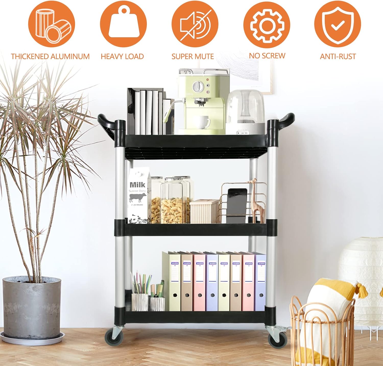 🐘【Rolling Cart with Wheels】Our rolling cart with 4 360° quiet wheels(2 lockable), so you can move the rolling cart anywhere without effort. Or securely hold the heavy-duty rolling cart in place for added stability.
