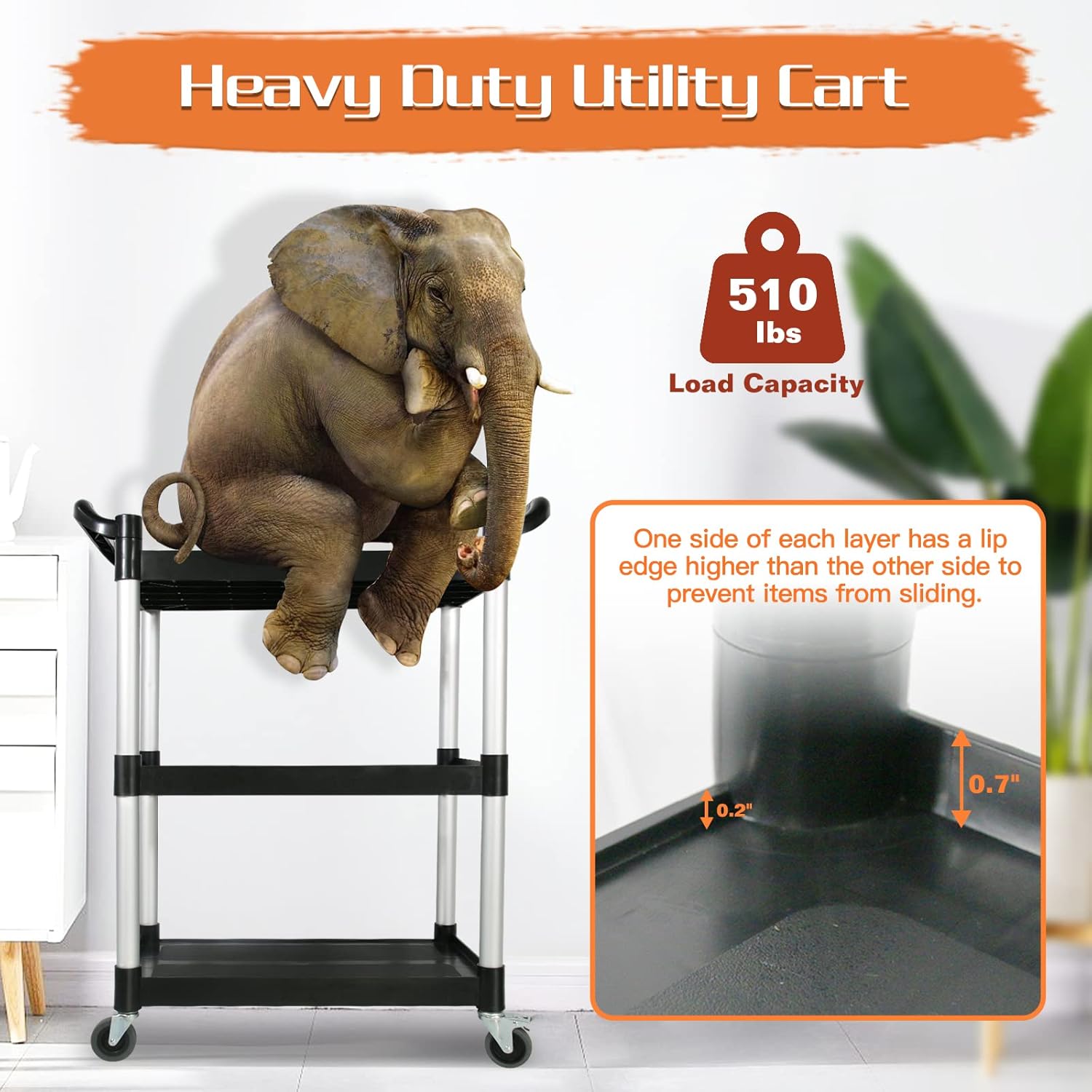 🐘【3 Tier Utility Carts with Wheels】This utility cart features a double-locking structure at the connections between the shelves and aluminum tubes, with two grooves at each joint to effectively prevent wobbling and collapse, ensuring absolute stability. 🐘 The shelf dimensions are: 24.5″ (L) x 15.5″ (W). It has a maximum weight capacity of 510 lbs (170 lbs per shelf), and the overall height of the utility cart is 37.8″.