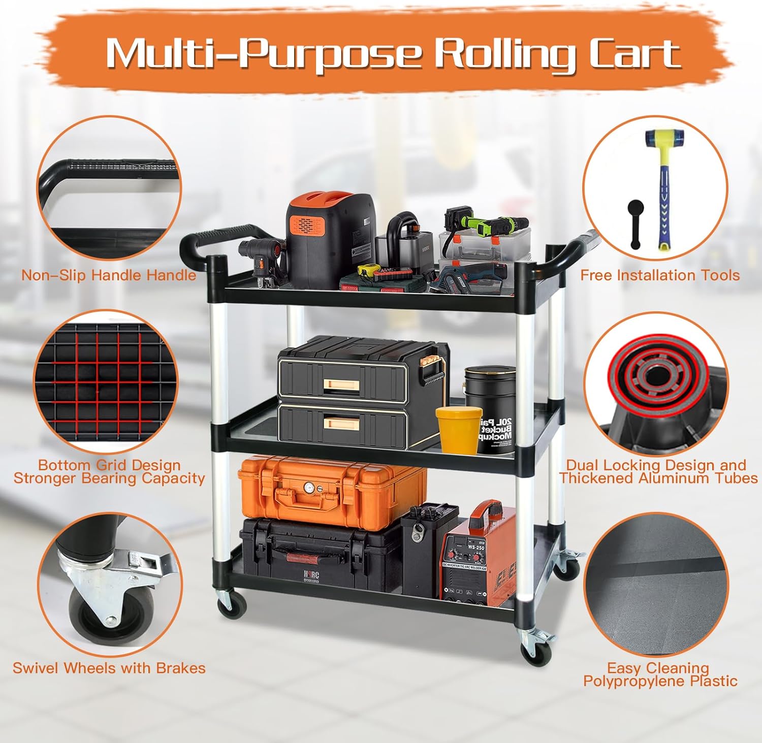Utility Carts with Wheels,3-Tier Rolling Cart with Wheels, Heavy Duty 510 LBS Food Service Cart with Rubber Pad and Hammer for Kitchen/Office/Warehouse, 31.5″ X 16.9″ X 38.9″(Black)