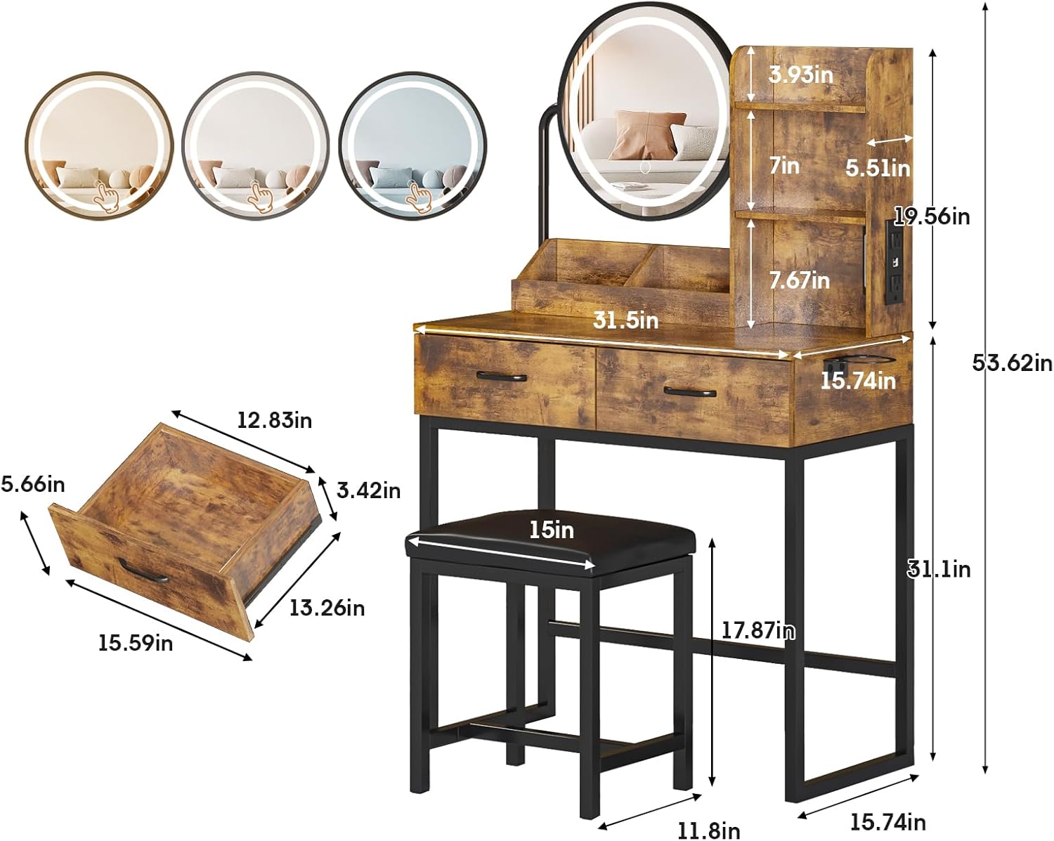 360° Rotatable LED Mirror: This makeup table comes with a charming round mirror with LED light, provide 3 color modes: warm light, natural light and bright white, can meet your different needs, perfect for home, salon or live broadcast