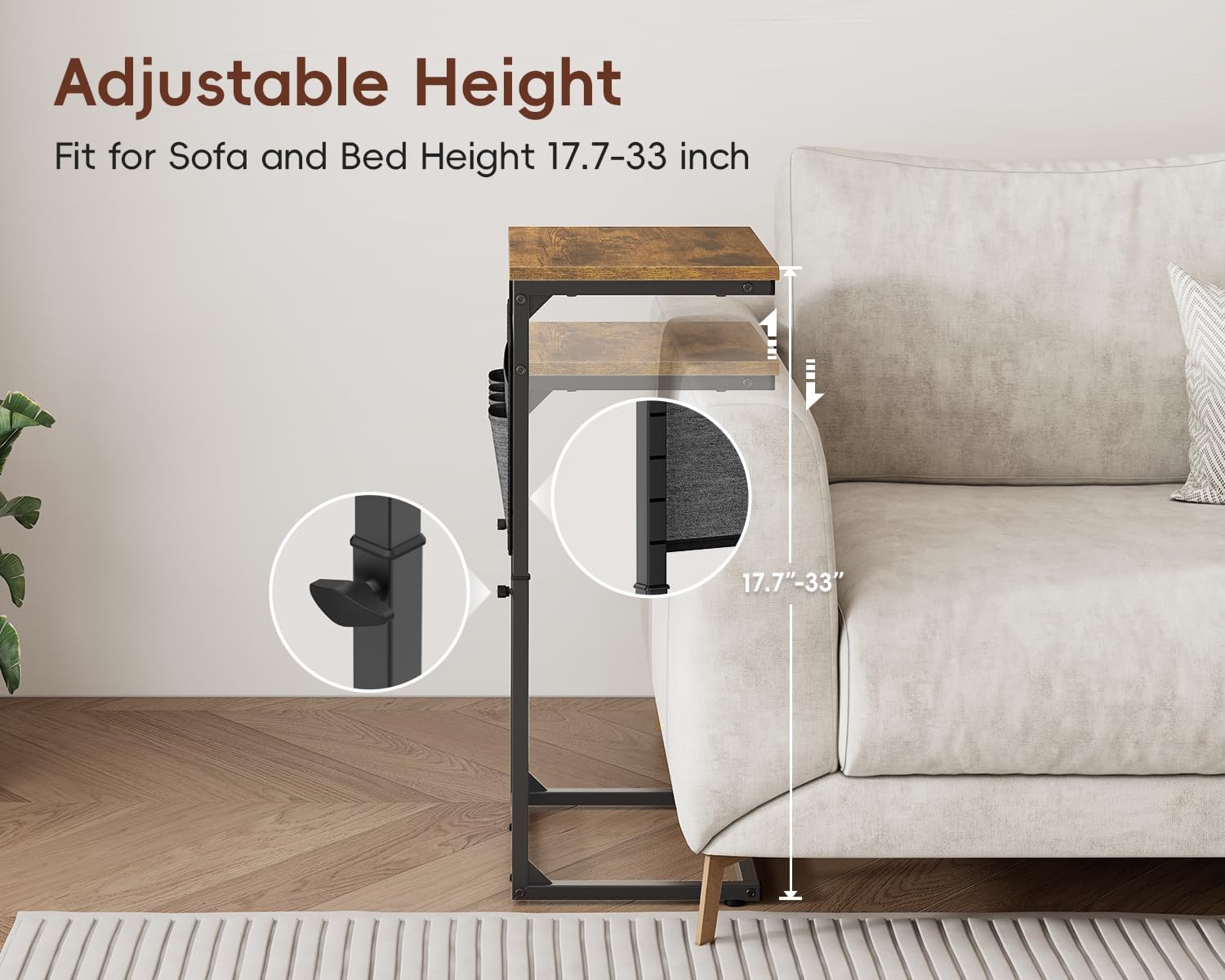 【Height Adjustable End Table】This small couch side table features an adjustable height mechanism. You can adjust height this sofa side table easily to your need by loosening and tightening the bracket screws and fit your recliner, bed, and over the couch table perfectly.