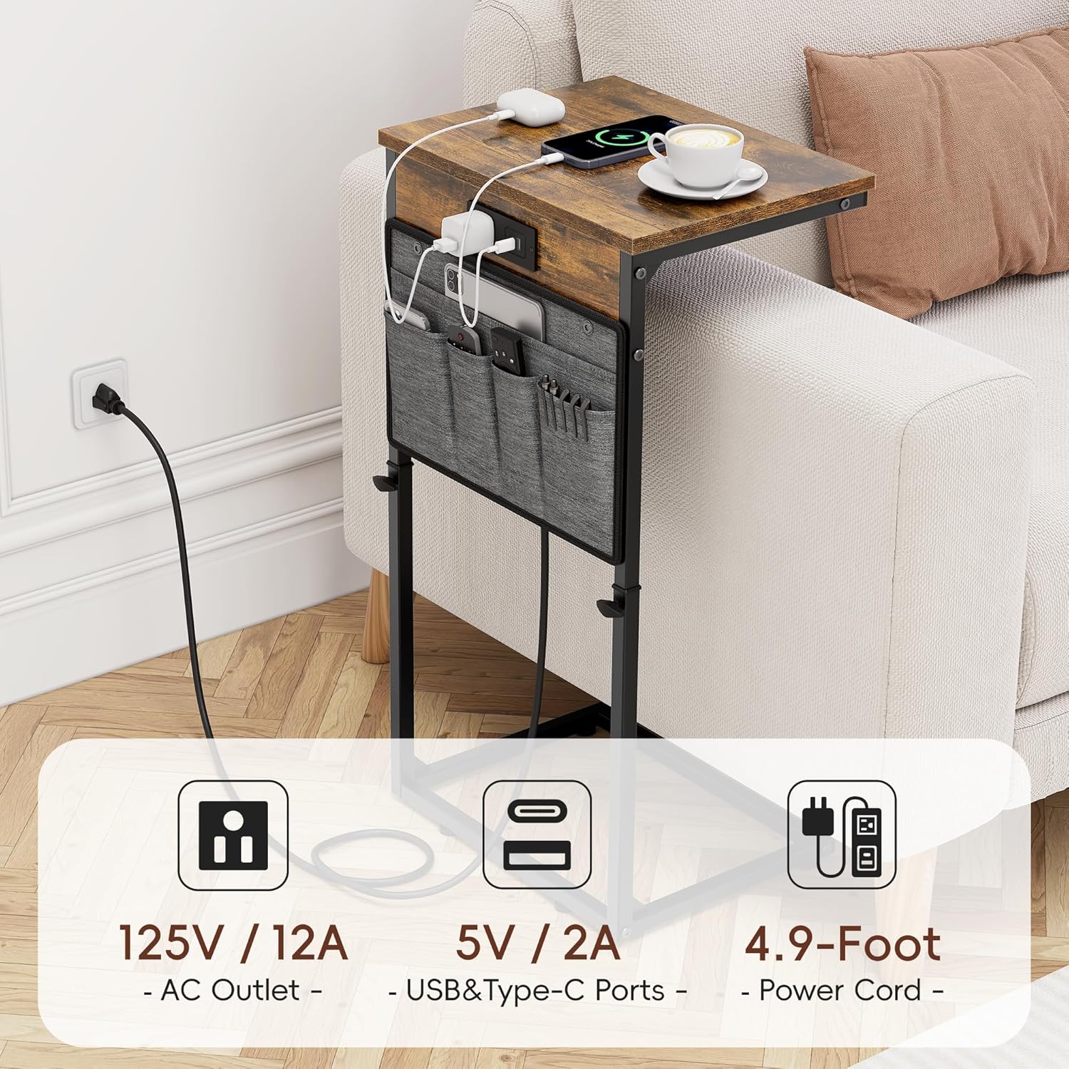 Vagusicc C Shaped End Table with Charging Station, 33″ Tall Side Table for Couch, Sofa Table Adjustable Height Small Couch Side C Table, Slide Under Sofa Tray Arm Table for Living Room, Bedroom, Brown