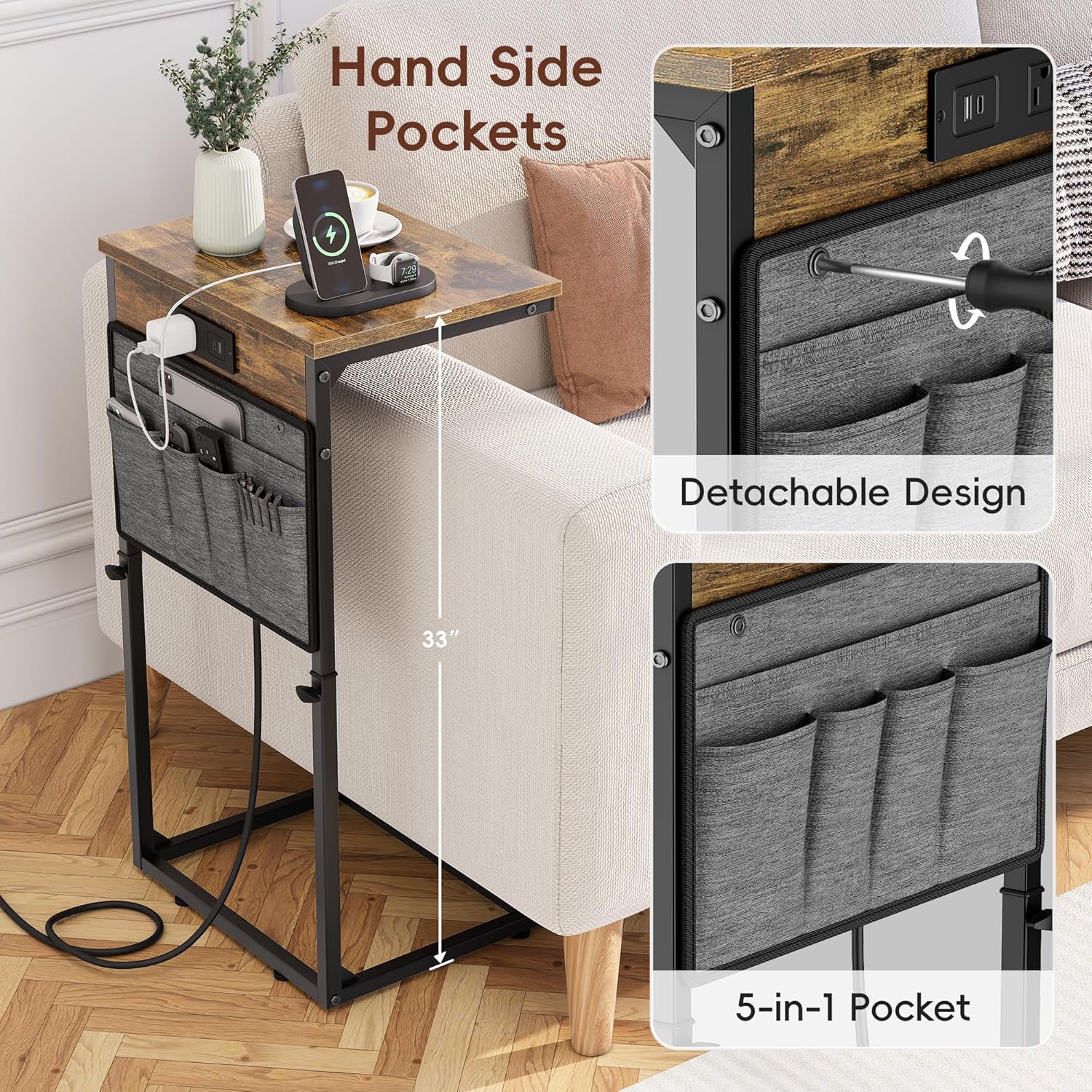 【End Table with Storage Pocket】Our c table for sofa provides enough storage space. One large bag of 14.35″*9.59″ for tablet and magazines, 4 small cloth bags for temporary storage of pen, remote control, mobile phone and charger save more room space.