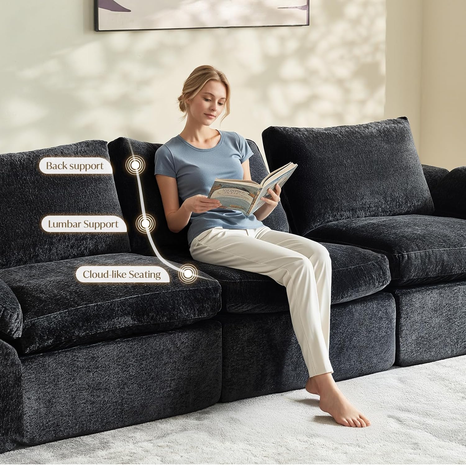 Cloud-Like Comfort: Come home to a low-profile cloud couch designed for optimal lounging and lying down. Its dual-layer cushion system combines a plush top foam that gently cradles your body with a dense base foam that resists sagging, offering lasting support